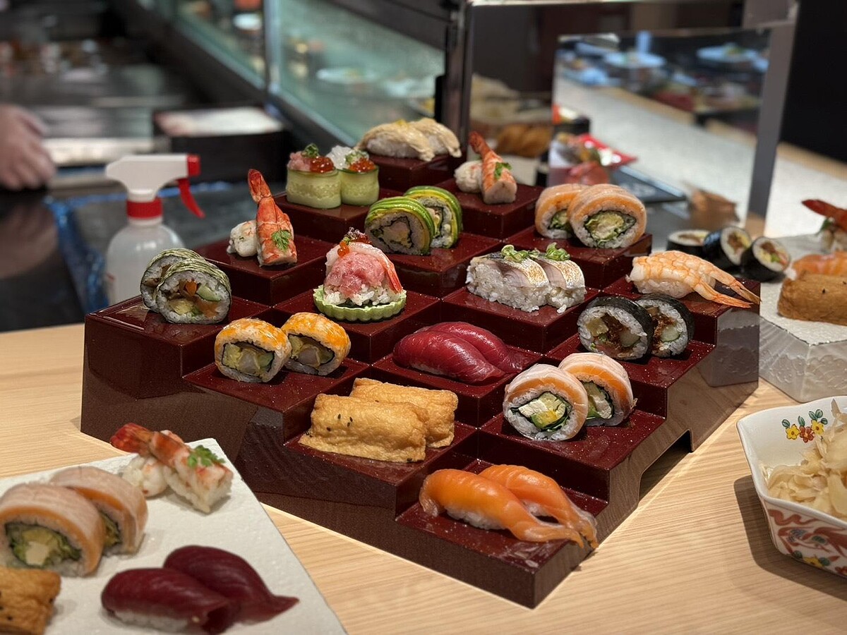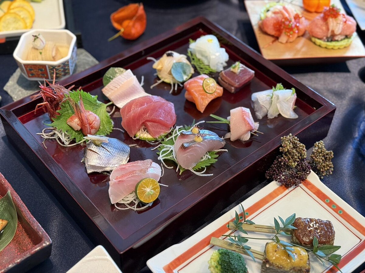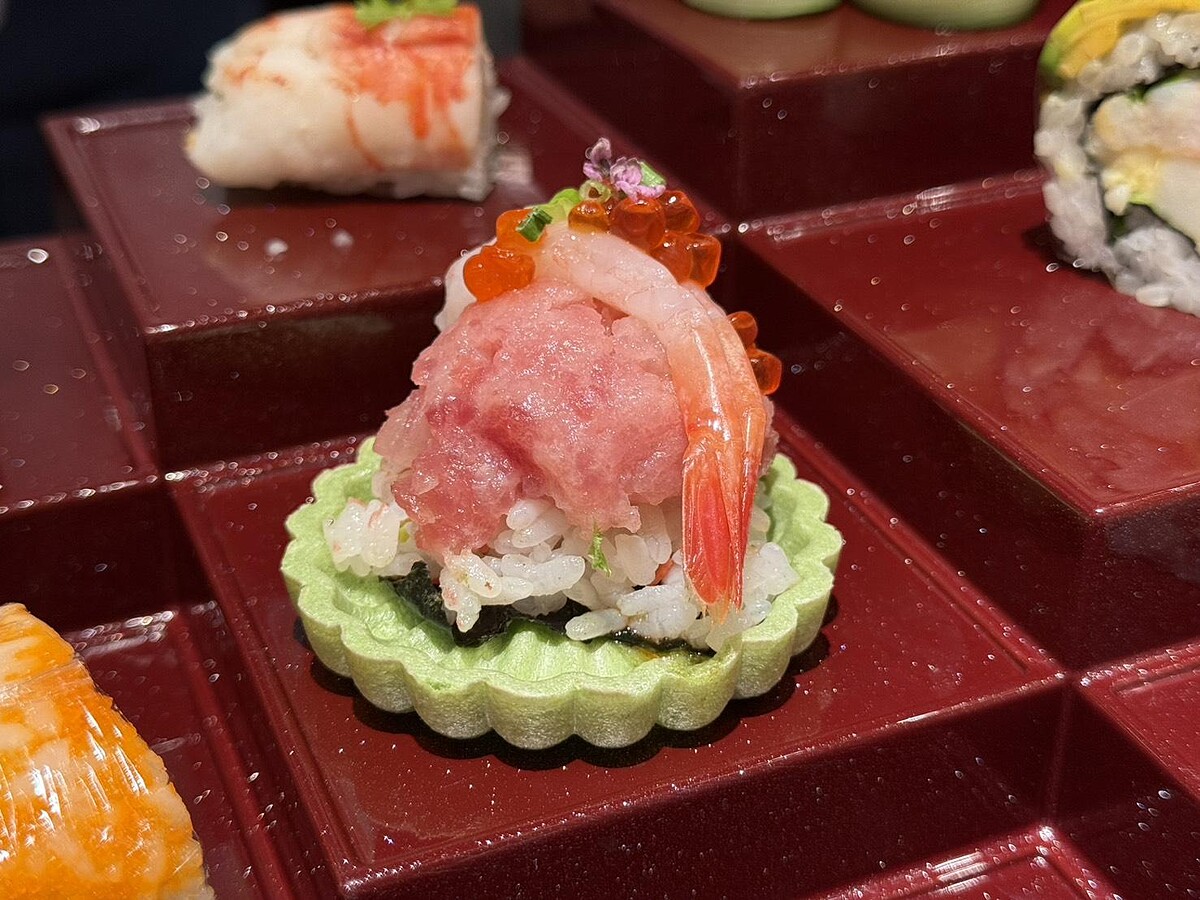 為了更貼近會席料理節奏,「NAGOMI 雅」在生魚片、壽司等經典餐檯之外,強化「先付」的呈現。器皿精緻、內容細膩,像是把一道道小缽變成桌上的風景。料理長推薦四款招牌,包括選用福島鰹高湯燉煮的「鮑魚旨煮」、微酸鮮明的「廣島牡蠣食蔬土佐凍」、滑順濃郁的「蟹肉海鮮胡麻豆腐」與宛如珠寶盒般的「最中餅丰盛壽司」,每一道都蘊含食材故事與風土細節。