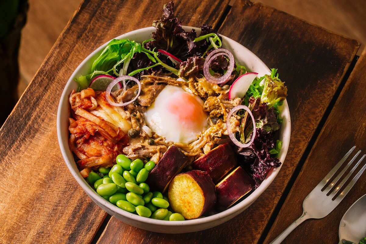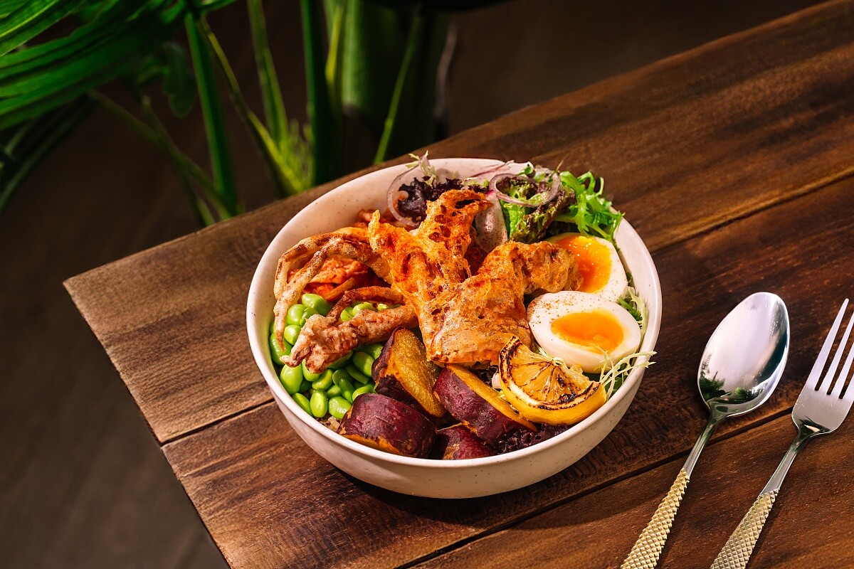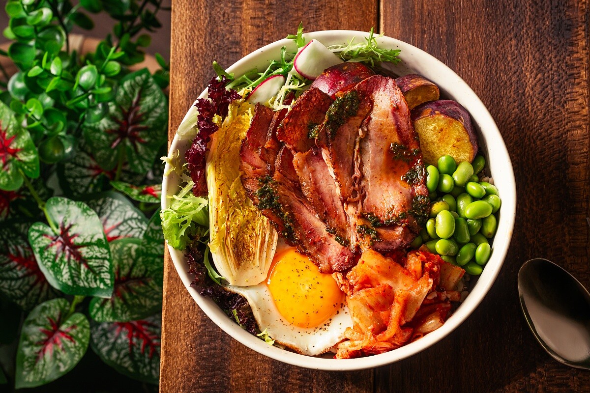 「佛陀碗」因為以原型食物為主要元素、調味清淡,且蛋白質與纖維質豐富,在國內外相當受到歡迎。在「Flare Taipei」以穀物米、沙拉、兩種各半,可依來客喜好調整。將自製阿根廷青醬與煙燻牛胸肉,搭配香料栗子地瓜、毛豆仁、太陽蛋與醃漬泡菜,綜合一同享用,依然是爽度滿分但低負擔的選擇。