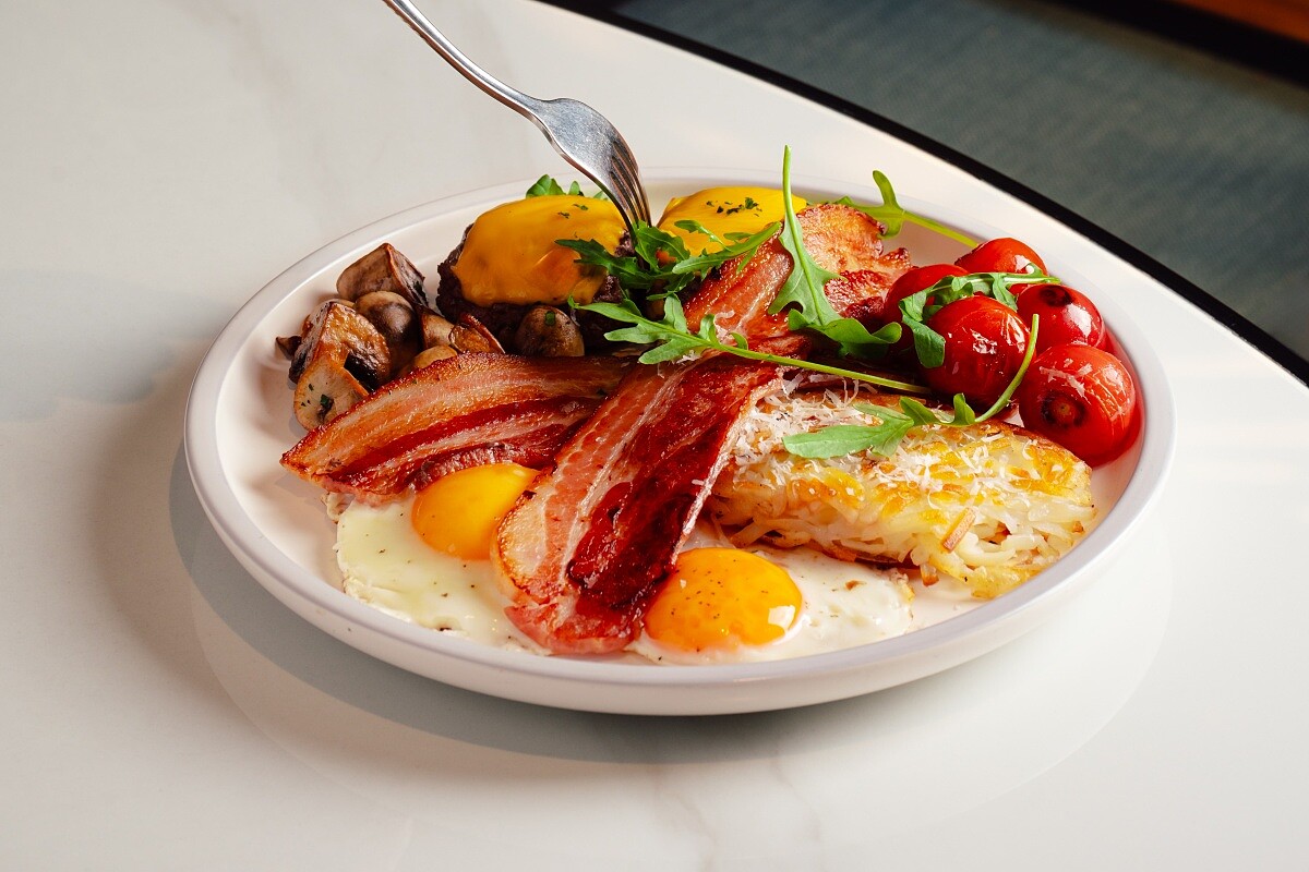 有別於上一道經典拼盤,Robert 希望設計一道給大食量客人的組合,集結手切厚培根、手打牛肉漢堡排、太陽蛋等爽度與營養兼具的蛋白質組合,搭配清爽的奶油蘑菇與橄欖油烤蕃茄,綜合著頗具份量感的香煎奶油薯絲餅一同享用,相當過癮。