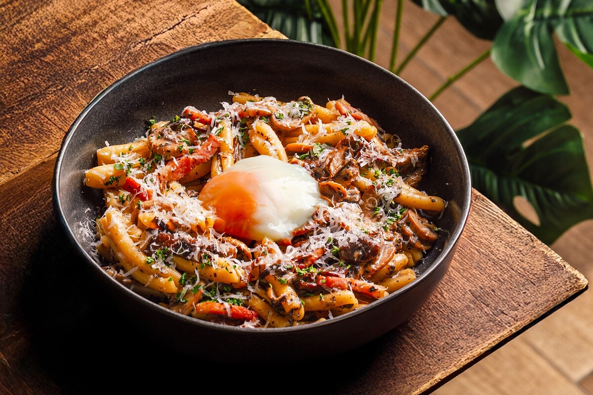 澱粉額度有限的推薦選擇,烹煮後自帶濃厚蕈菇香氣的茶樹菇,搭配大量蘑菇、具有厚度的培根細條,再放上溫泉蛋,以及口感扎實的辮子麵條,是濃郁又清爽的好滋味。