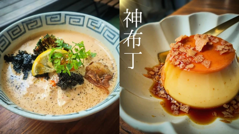 「Concept La'麺Knock Out 」外觀是不顯眼水泥牆,低調的裝潢裡頭藏著令人驚喜的創意拉麵。湯頭以雞白湯和蝦拉麵為主,來自日本的老闆將日式拉麵與法式料理巧秒融合,擺盤美的像藝術品,還可以加入黑松露醬、起司提味,直接扳倒你對拉麵的想像。飯後必吃的甜點「神布丁」濃濃的蛋香上頭灑滿巴芮脆片,入口瞬間化開、奶香四溢,是吃完還會無限回味的極上美味。
