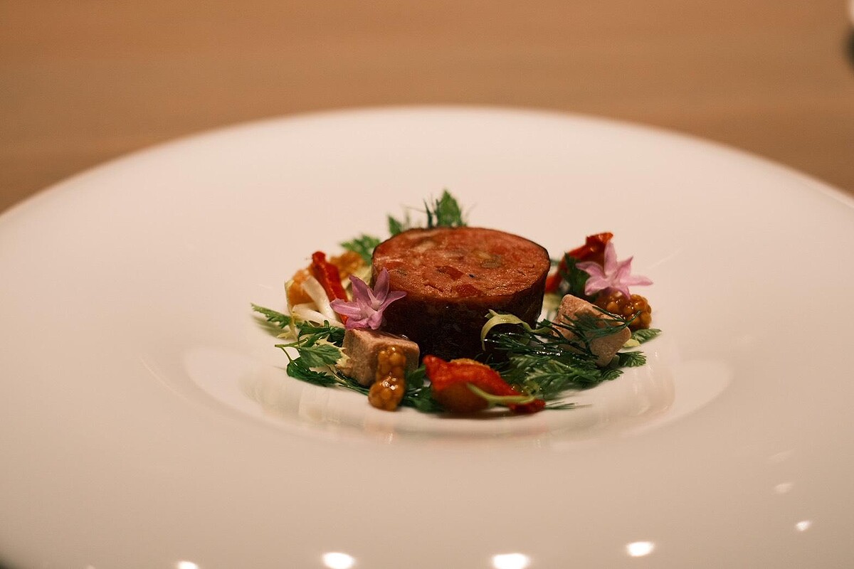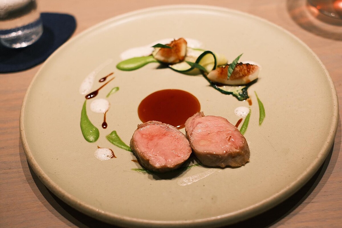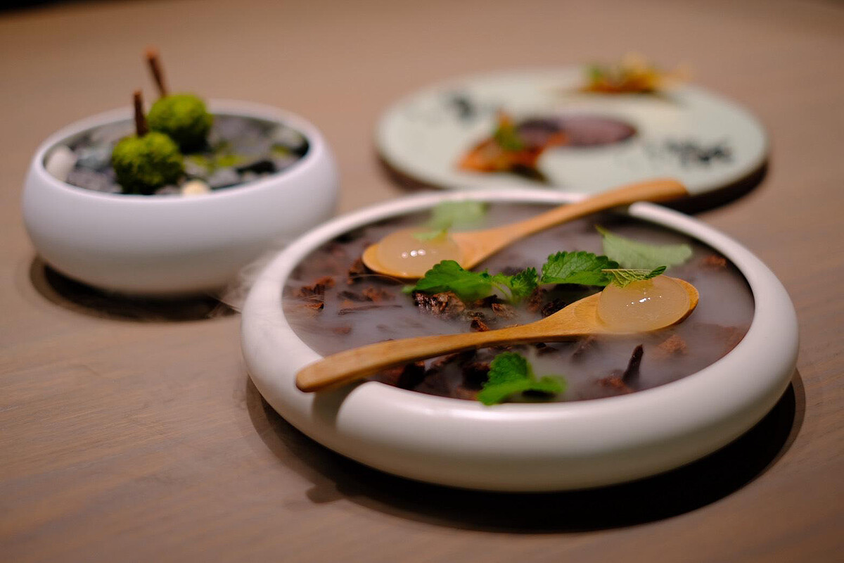 進入主菜段落,〈醞藏〉選用風乾鴨脖香腸、鴨肝與醃西瓜,向西南法鄉村料理致意;〈初心〉則以澎湖章魚搭配義式甜椒燉菜,回溯主廚料理旅程的起點;〈野徑〉以紐西蘭犢牛肋眼為主,佐無花果、馬鞭草與清香泡沫,引導味蕾步入盛夏山林。甜點部分,〈澄〉以白桃冰球與18天生啤酒泡沫清爽轉場,〈晴〉則用芒果、甘酒與桂花收尾,描繪午後陽光與穀物香的餘韻。另提供升級主菜〈醇〉,使用以巧克力飼育的澳洲和牛搭配焦化洋蔥與發酵李子,層次濃郁而鮮明。