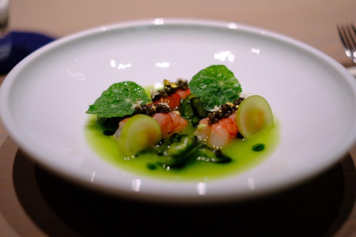 今年夏季江丕禮以「台灣森林與海洋」為題,設計出一套由清晨至日暮展開的九道式套餐。從味覺出發,對應晨間露水、午後熱浪與黃昏森霧,鋪陳一場意象與風味交織的季節對話。三款開胃小點由芭樂晶球、湖南臘肉與開心果乳酪組成,分別象徵清晨的露氣、正午乾熱與傍晚林間的柔光。冷前菜〈綠意〉以龜山島胭脂蝦搭配小黃瓜與青葡萄,透過紅綠配色與海風鮮甜展現沿岸之美。溫前菜〈界〉則將北海道干貝、綠竹筍與松針油組構為山海交界的層次意境。