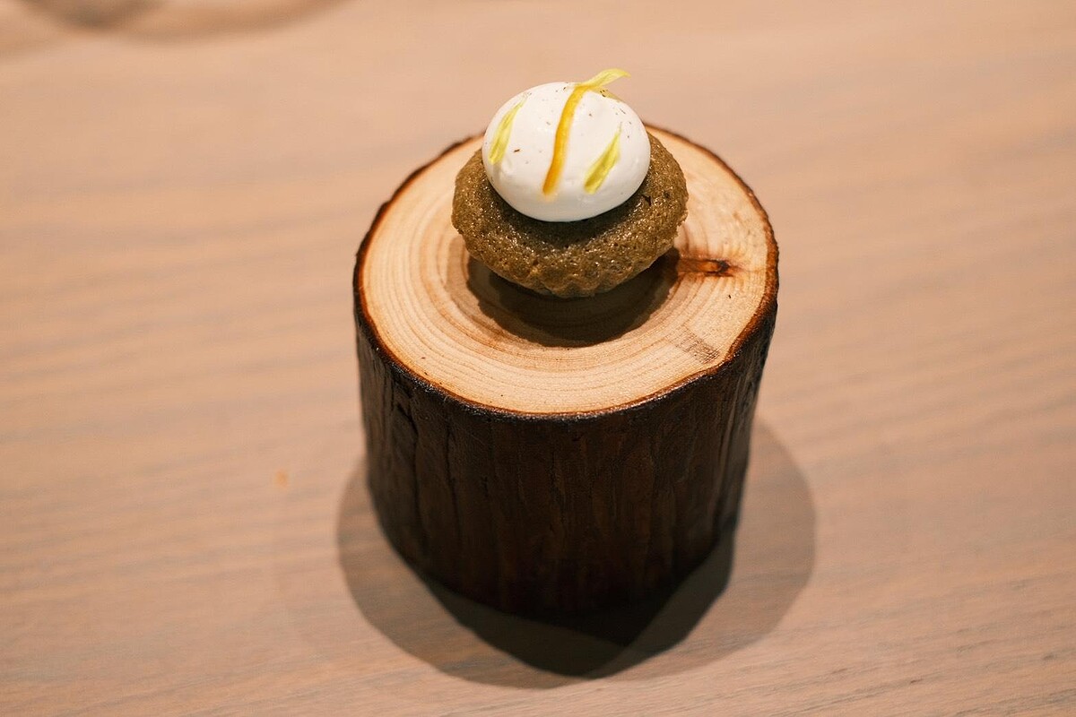 在空間方面Brisé也進行調整,將主廚的料理節奏具象為設計語彙,開放式中島採自然岩石色調,搭配金屬鏽蝕、原木板前桌與岩石孔洞牆面,展現質感與野性之間的平衡。淺木色桌面、鼠尾草綠高椅與粉白植栽點綴其間,營造輕盈明亮、富含手感的法式情境。板前座位區共設16席,餐桌深度達90公分,便於展演上菜節奏,並讓賓客能同步欣賞廚藝細節。整體空間與菜單相互呼應,傳遞料理應有的節氣、感受與當下。