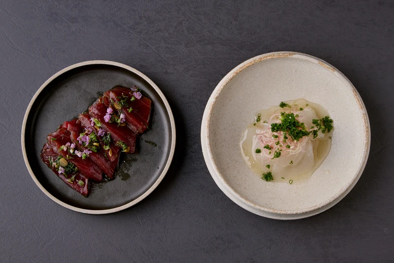 黑鮪魚赤身/韭菜醬油:特選黑鮪魚赤身部位,佐上特製韭菜醬油,紫蘇花碎增添草本清香,更凸顯赤身獨特的海洋風味。 比目魚/煎酒: 嚴選日本活締處理來台的新鮮比目魚,以削切手法呈現半透明肌理,配上傳統煎酒醬汁,甘醇芳香襯托著比目魚刺身細膩的口感。