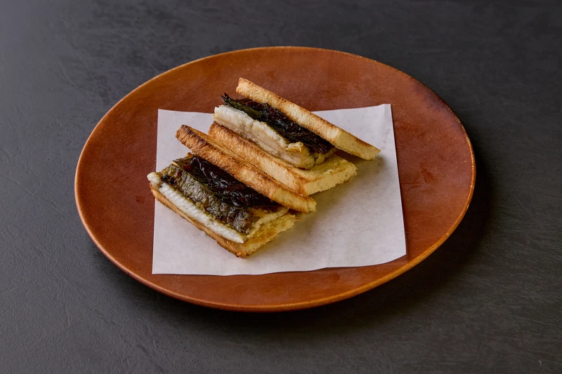 將蓬鬆柔軟的特選白土司輕烤至表面微酥,塗上微辛絲滑的自製山葵 Cream Cheese,夾入鹽烤日本星鰻,與燒海苔、紫蘇昆布佃煮絲交織出和洋併融的和諧滋味,是一道充滿幸福感的療癒料理。