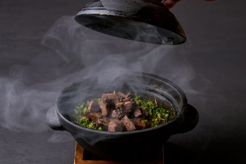 關鍵食材選用 A5和牛芯芯部位,低溫舒肥處理後煎至表面微焦,甘甜嫩口。嚴選台東金賞御用米與新鮮牛蒡絲和特調高湯一同烹煮,最後拌入和牛肉,撒上蔥花、有馬山椒粒,拌進甜鹹醬汁,整體香氣濃郁飽滿,為套餐尾聲留下豐富的和風底蘊。