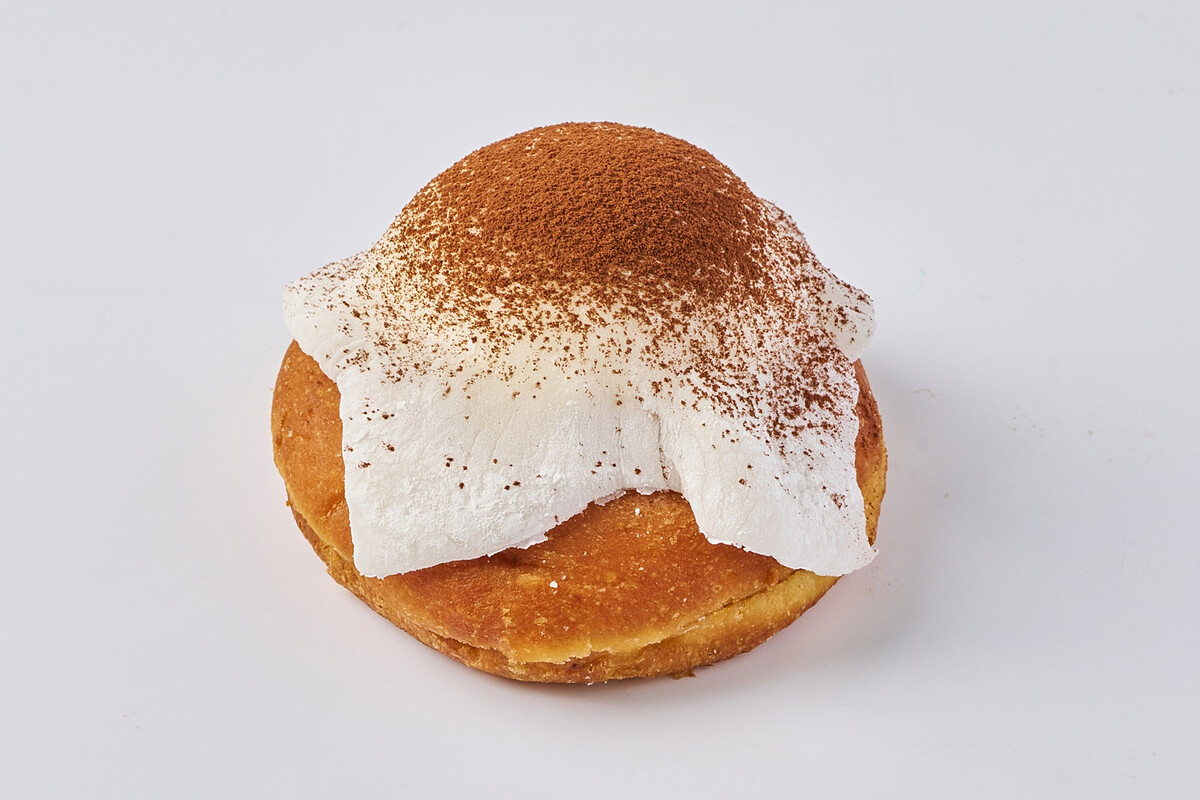 由2023年日本麵包大賽最高金賞得主橋爪謙典客座研發,這款「提拉米蘇雪福」堪稱甜點控夢幻逸品。生甜甜圈切半後抹上濃縮咖啡醬、鋪上整塊提拉米蘇,再覆上一層軟Q麻糬皮,表層灑上可可粉收尾。甜而不膩、柔中帶彈,一口咬下像是同時吃到提拉米蘇、大福與甜甜圈三種甜品。售價100元,是本季話題度最高的聯名作品。