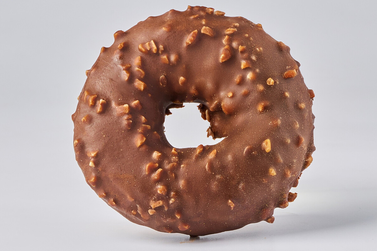 重可可控請報到~「金莎可可」選用義大利知名巧克力品牌的榛果醬,甜甜圈整體裹上濃郁可可醬後,再沾裹一圈香脆杏仁角,堅果香與巧克力香相互輝映,外酥內綿,吃得到香、濃、脆三重奏。售價75元,是視覺與味蕾雙重滿足的經典系升級版本。