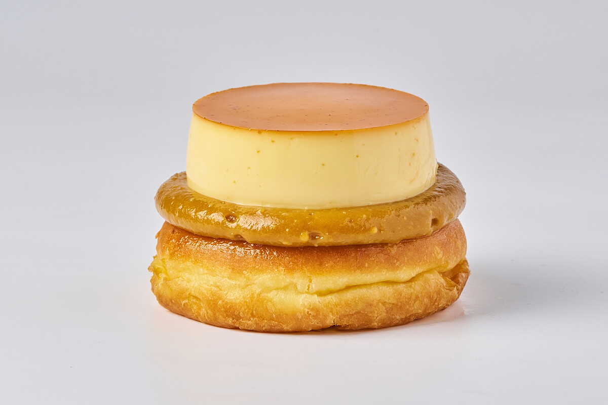 誰說布丁只能放盤子?這次新品「焦糖布町」直接把一整顆大顆香草焦糖布丁疊上甜甜圈本體,再用濃郁焦糖卡士達醬包圍,甜中帶著焦糖微苦,香草奶香與溫潤酵母香交織,層次豐富。售價90元,一開口就是甜點界的雙重暴擊。