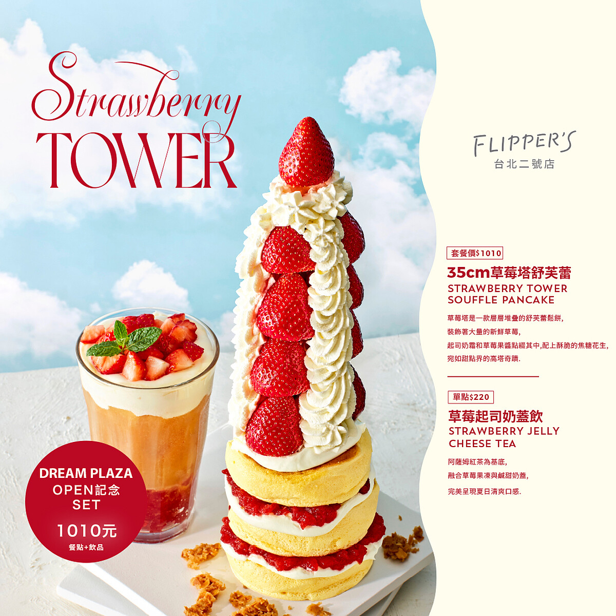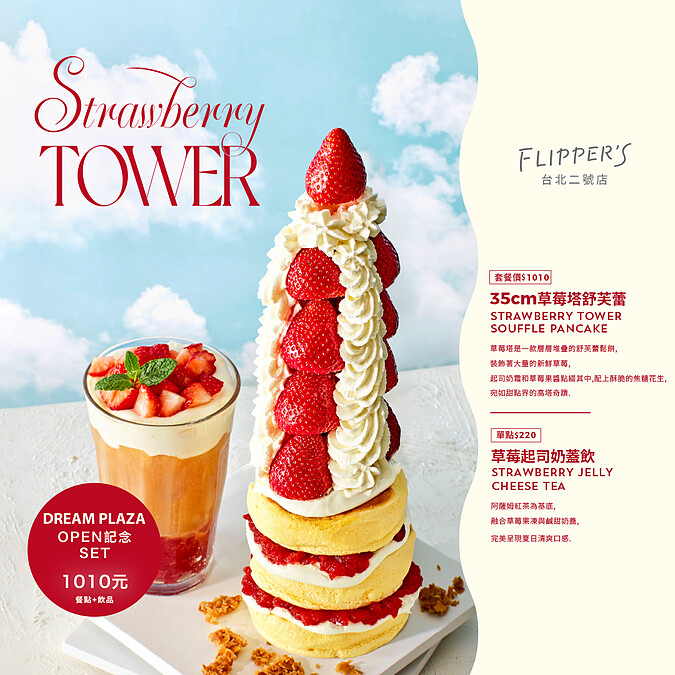 這道舒芙蕾塔的靈感,來自日本總監一次來台考察時,望見台北101的瞬間,他對團隊說:「我們應該為台北,做一道能代表這座城市的甜點。」於是「FLIPPER’S」日本本部的研發團隊啟動設計,從結構、材料到視覺比例,最終堆疊出高達35公分視覺驚人的「舒芙蕾草莓塔」。此道甜品以柔軟舒芙蕾為基底,搭配起司奶霜、生奶油、草莓果凍、焦糖堅果與當季新鮮草莓,宛如甜點界的台北101,不只好吃,更讓人忍不住拍照上傳。目前僅在「FLIPPER’S」 2號店販售,這款「可以吃的地標」,讓人充滿期待啊!