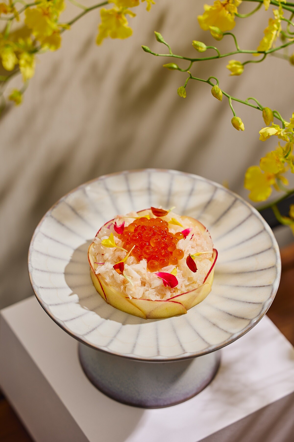 以北海道松葉蟹絲鋪滿蛋糕表層,佐以柚子凍,點綴蘋果薄片與鮮嫩鮭魚卵;中層為綿密柔滑的起司蛋糕,表層薄抹酸奶,底層隱藏來自屏東東港的旗魚鬆與鮪魚鬆,巧妙遊走台式與西式鹹甜風味。