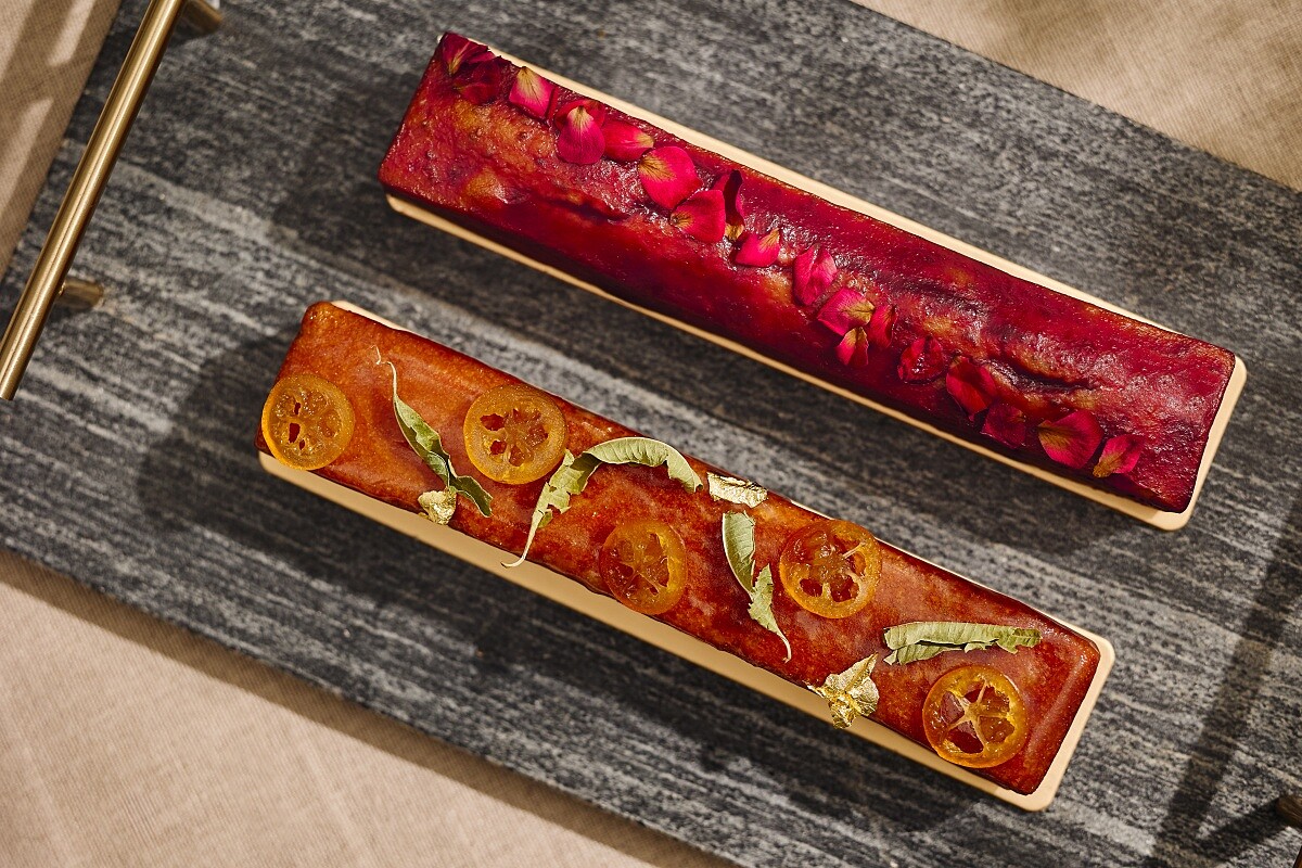 「柚子磅蛋糕」以金棗、馬鞭草、金箔裝飾,擁有飽滿的酸甜滋味;色澤美麗的「玫瑰磅蛋糕」則以紅櫻桃與紅醋栗果泥增添柔和果酸,並裝飾新鮮食用玫瑰花瓣,三款皆具有濃郁的天然奶香與蛋香,皆非常適合各式茶類,百搭不膩。