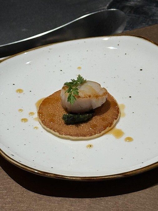 明星料理「干貝楓糖奶油鬆餅」以甜鹹交織詮釋奢華滋味,鬆餅是鐵板現煎,外酥內綿,而頂級2S生食級干貝在鐵板上煎至金黃微焦,封存海洋的飽滿鮮味,再佐以昆布奶油與楓糖奶油,鹹香與甘甜堆疊交融。另一必吃還有「煙燻熟成牛腹」,選用牛腹部位,歷經24小時香料醃製、8小時低溫慢煮。