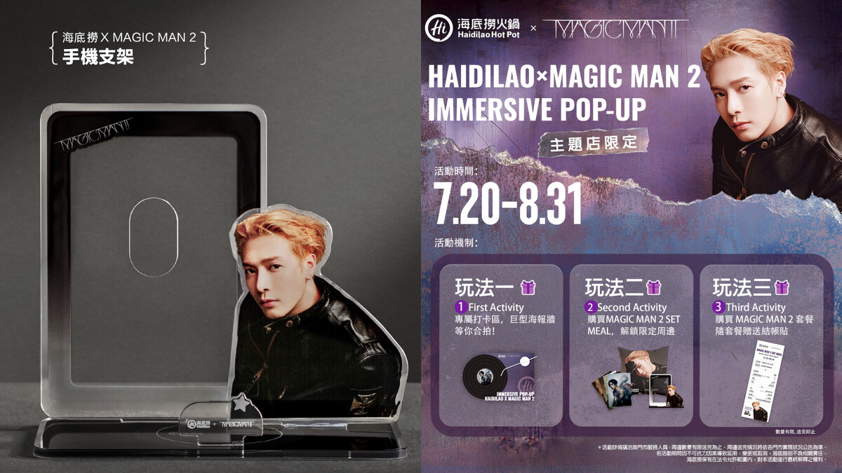 這次聯名還特別打造3間海底撈MAGIC MAN 2主題店,地點鎖定台北西門、台中廣三SOGO及高雄巨蛋。店內以沉浸式設計營造王嘉爾的音樂世界,並規劃打卡點讓大家拍出專屬於這場聯名的照片,從吃鍋到拍照都充滿儀式感。從味蕾到視覺、從菜單到周邊,全部都是王嘉爾的專屬印記,粉絲們心動不如趕快行動。