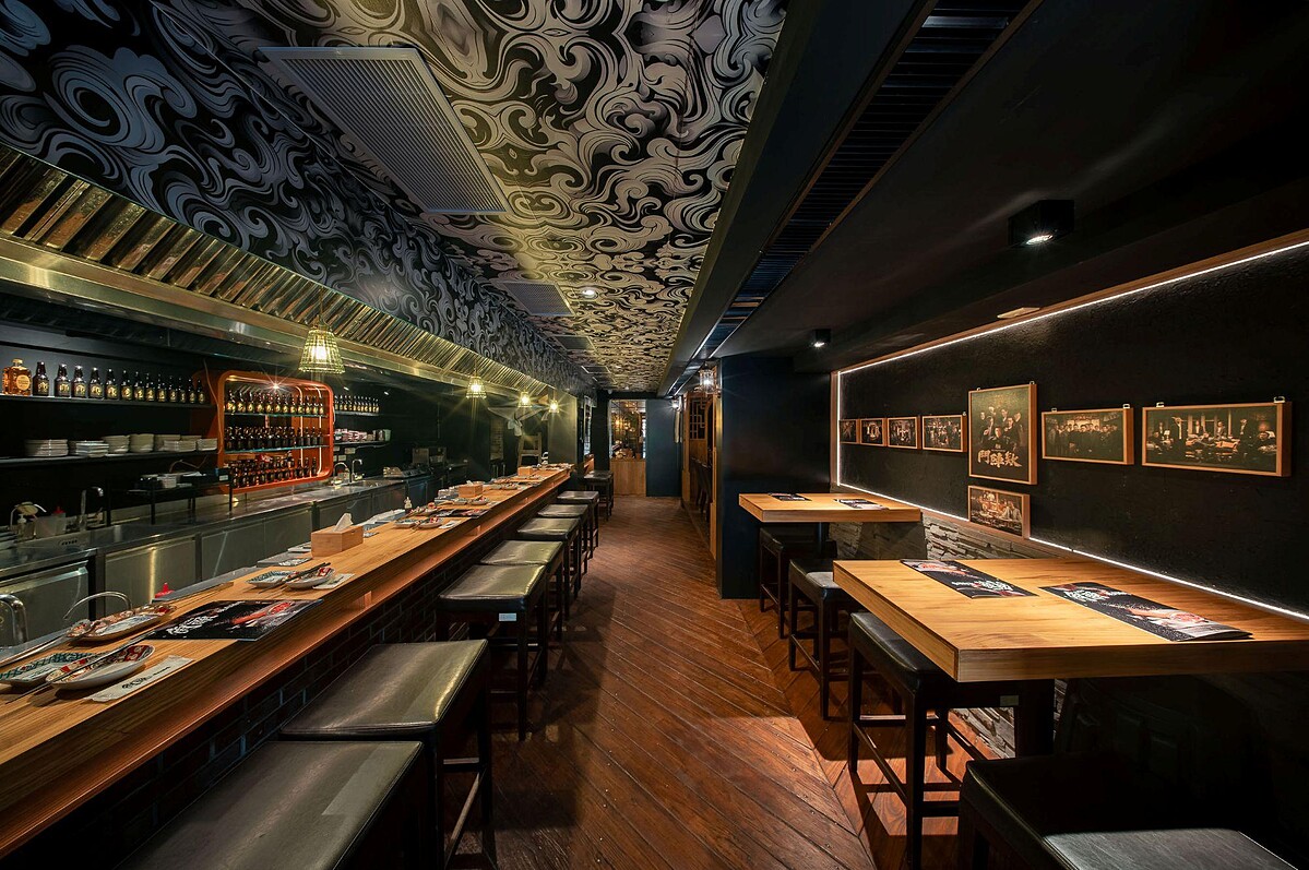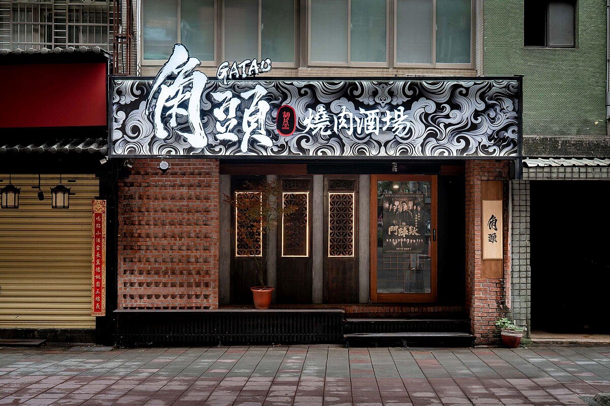 走進「角頭燒肉酒場」的瞬間就像穿過電影場景,店外巨型「角頭」匾額高懸,宛如堂口門面,推開厚重木門,腳下的仿舊木地板帶著歲月斑駁感,氣氛瞬間轉換。天花盤旋著以半甲刺青紋理延伸出的黑白漩渦,牆上掛滿劇照,像一層層堆疊的經典記憶。包廂區更以潑墨筆觸勾勒出角色剪影,每一個輪廓都在致敬江湖裡不容妥協的風骨。吧檯後整面酒牆列陣,昏黃燈影灑下,讓人一腳踏進電影世界。