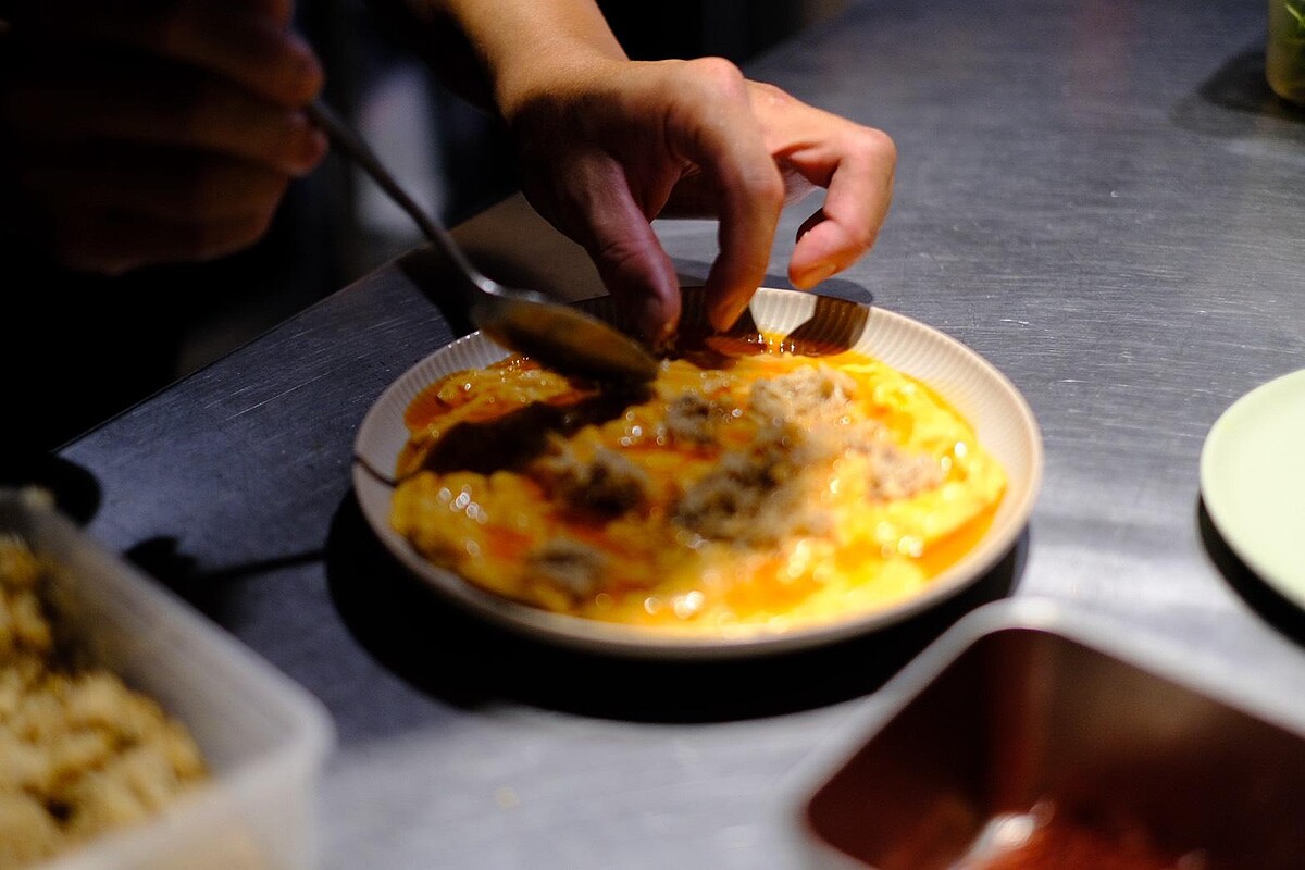 新菜單以蛤蜊絲瓜澄清湯為靈魂,延伸出一系列具記憶感的料理,從蛤蜊可樂餅配海藻醬到烏魚子蟹肉歐姆蛋,保留法式精準的層次之餘,同時融入日式調味的留白。主菜如煎烤鮭魚肚佐檸檬蛤蜊奶油醬讓大地與海洋在舌尖相遇,松露奶油野菇雞肉捲與澄清雞湯拉麵的組合則將街頭風格與高端料理放在同一張餐桌上對話。Tank認為「湯是料理的開端,也是情緒的基底」,因此在這裡高湯不僅是一種配角,更是所有風味的源點。