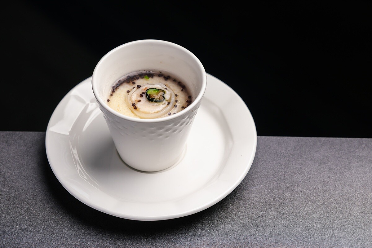 這道菜源自與簡天才師傅團隊討論「二路菜」的新可能。台菜傳統在冷盤之後會上羹湯,以勾芡帶來飽足感並展現現做功夫;法餐則有以蛋液蒸烤成型的鹹布丁。於是,主廚將兩者融合,轉化為高湯蒸蛋的形式。當季綠竹筍切成薄片捲入花枝漿,展現細膩刀工,蒸蛋表面鋪上蟹黃與蟹肉,再以魚子醬點綴,讓海味與蛋香層層交織。這道菜既保留了台菜「二路菜」的精神,也融入法餐的優雅與平衡。