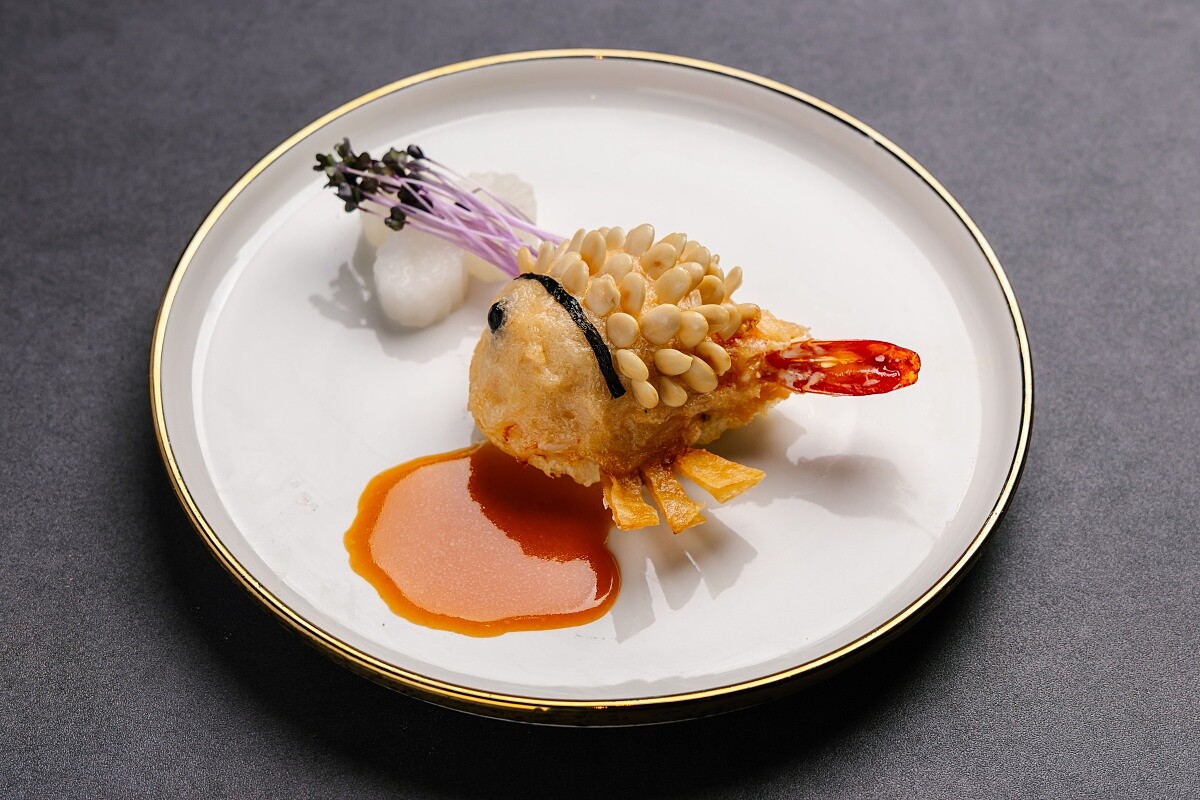 以欣葉經典「鯉魚大蝦」與「招牌海山醬」為基礎,簡天才師傅將龍蝦殼與多種蝦膏細火熬製成濃郁蝦醬,與原有海山醬融合,賦予醬汁更深的香氣與層次,化為全新的「龍蝦海山醬」。鯉魚大蝦的靈感來自早年「擬派」的做法,因為當時是魚價高昂的年代,以蝦泥塑形成魚排的形狀,底部鋪上吐司象徵體面。此次特別設計出適合油炸且不吸油的吐司配方,讓口感更輕盈。這些細節的更新,使這道菜在保有台菜精神的同時,帶來既熟悉又新鮮的海味體驗。