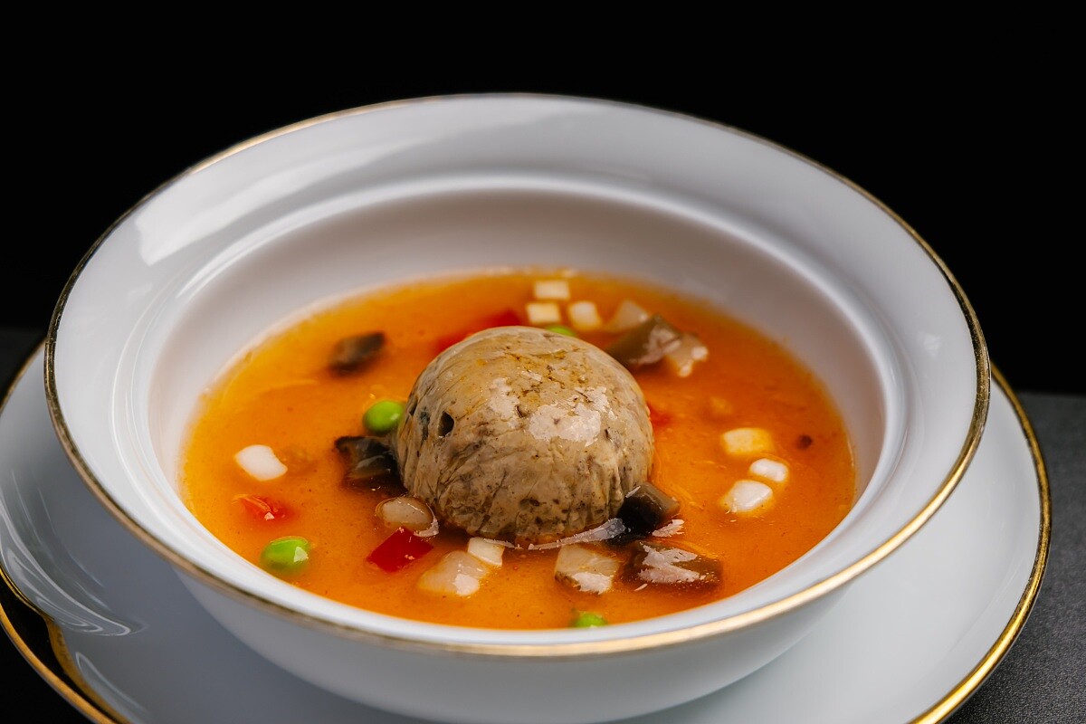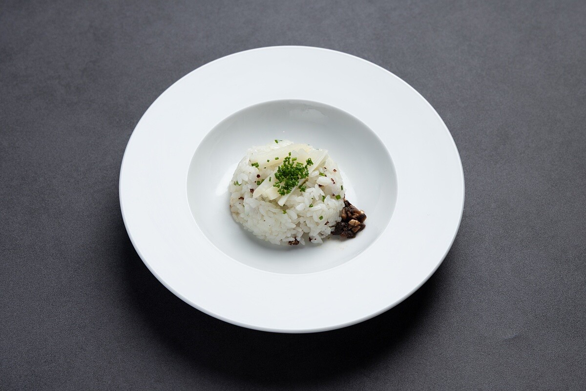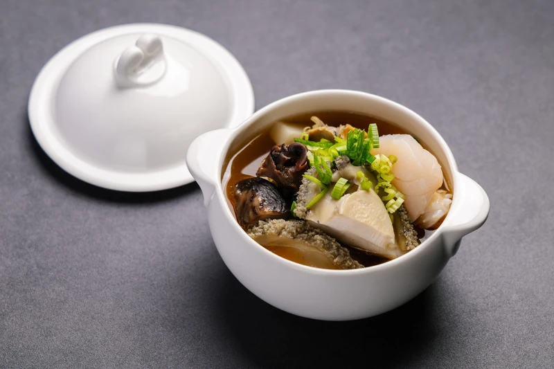 靈感來自起源自北投的經典湯品、俗稱的酒家菜「魷魚螺肉蒜」,以青蒜的甜香、乾魷魚的鮮味與罐頭螺肉的鹹香交織出鮮甜平衡的滋味。此次合作改以法式澄清湯的技法重構湯底,去除羹湯的稠感,保留罐頭螺肉元素,同時加入新鮮螺肉、干貝與鮑魚,讓海味層次更豐富。湯色清澈,入口先是蒜香與海鮮的鮮甜,尾韻則帶有台菜特有的澎湃氣勢與法餐的細緻優雅,成為宴席中的亮點之一。