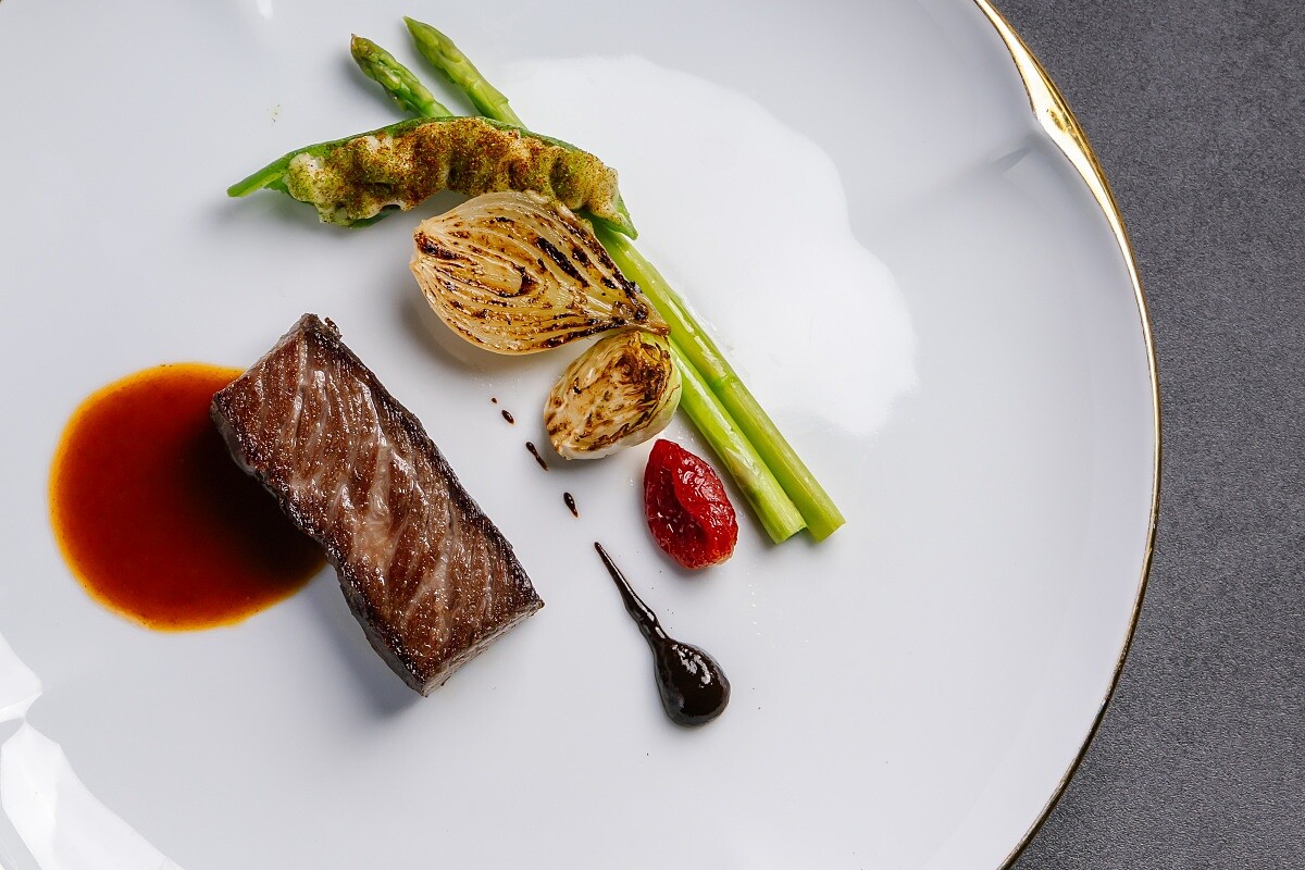 由簡天才主廚獻上,選用油花分布均勻的美國牛小排,在沒有烤箱、完全以煎製的方式完成七十人份,火候與溫度精準到位,相當不易,且入口柔嫩多汁,焦香與肉香交織。他以法式技法濃縮肉汁,讓熟成紅肉的香氣與深度更加集中,展現火候與時間的張力。