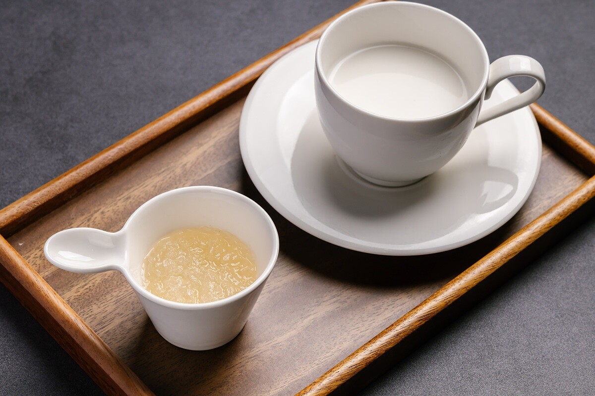 在甜點上桌前,團隊還細心討論飯的份量與擺盤,希望既不讓賓客感到過飽,又能保有視覺美感。最終決定延續台式餐飲的甜湯傳統,由欣葉董事長提議,以招牌杏仁茶搭配3A級燕窩,成就溫潤細膩的「杏香輕語」,為整席留下柔和尾韻。