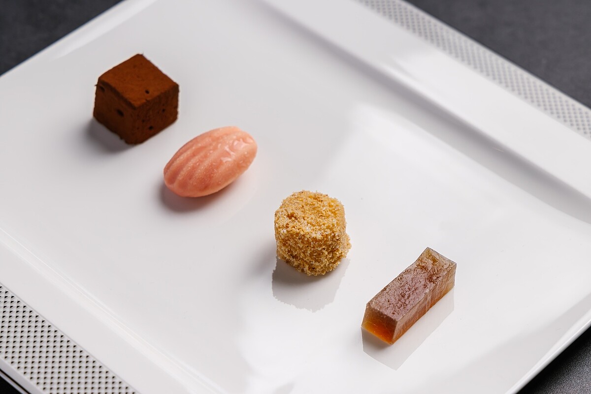法式 Petit Four「餘韻如詩」則由雙方聯手呈現。簡天才師傅帶來莓香冰糕、巧克力棉花糖,以及以台灣冬瓜糖改良的琥珀糖,寓意台菜未來的多種可能;欣葉則以麻糬延續品牌傳統。佐上一杯龍眼花茶,讓宴會在中西合璧的甜點與溫熱茶香中優雅收束,餘味綿長。