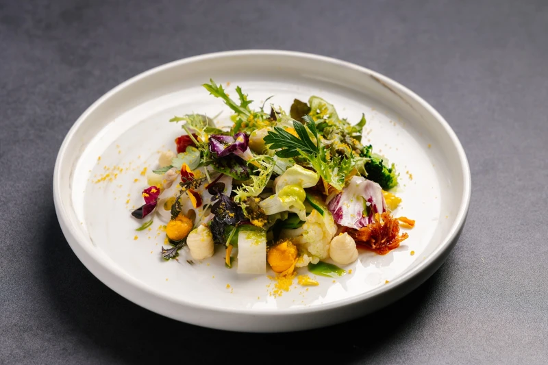 靈感來自簡天才主廚的「大地沙拉」,將西餐沙拉文化轉譯為亞洲的溫拌形式。選用當季時蔬與金花果葉等食材,依部位搭配不同處理手法與醬汁,並結合欣葉自製 XO 醬與烏魚子粉提鮮,呈現溫潤而有層次的風味。在蟹黃、魚子醬等濃厚味覺之後,適時以這道溫沙拉轉換口感、解膩,成為承先啟後的橋段。