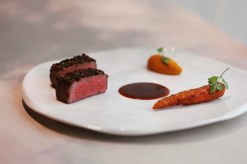 主菜是七夕限定的「巧克力和牛/小紅蘿蔔/可可豆碎/奧勒岡」。選用澳洲巧克力純血和牛,育肥期以巧克力餵養,使油脂香氣與肉質甜美兼具。煎至恰到好處的熟度後,外層裹上烘烤可可豆碎與黑胡椒,入口先是微苦與辛香交織,隨即化為濃醇的巧克力氣息,猶如愛情中苦甜並存的悸動,搭配可可醬牛肉汁,香氣與滋味層次分明將浪漫推向高潮。