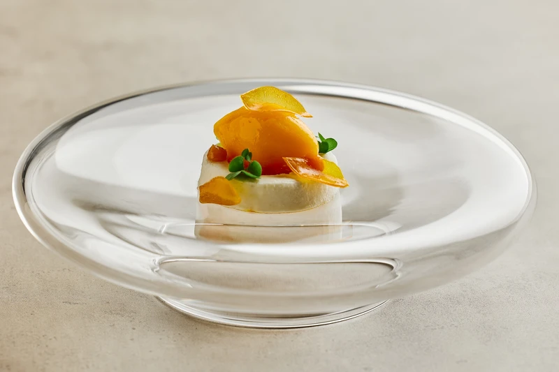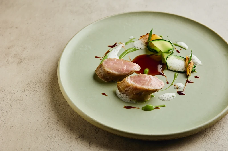 Chef Pili以台灣盛夏從清晨到日暮的景色開啟序幕,3款開胃小點各自對應不同時段,芭樂晶球宛如晨露輕喚味蕾、燻香臘肉帶來正午陽光的熱烈餘韻、開心果乳酪包覆著傍晚森林的溫潤光影。冷前菜「綠意」結合小黃瓜與青葡萄的清甜,映襯龜山島胭脂蝦的鮮美;溫前菜「界」則以日本干貝與台灣綠竹筍交融,松針油串聯山與海的氣息;熱前菜「蘊藏」用手工鴨肉香腸表現時光積累的深層風味;海鮮熱前菜「初心」選用澎湖章魚,搭配義式燉甜椒與烤紅椒堅果醬,致敬主廚創作初衷。