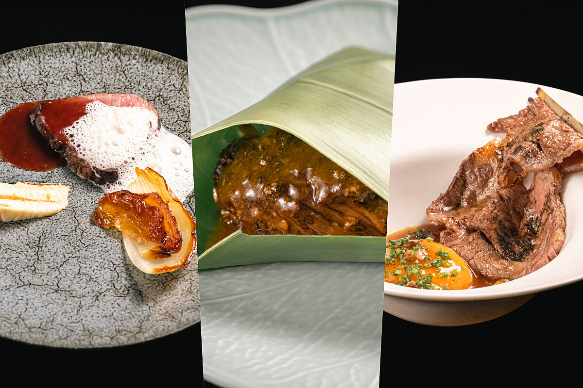 來自 AKAME 經典呈現的「牛三吃」,皆選用雲林「農場晃晃 Farm Around You」專屬契作牛,為安格斯牛與台灣黃牛混種。以三種部位、三種手法,展現部落語彙中的火、土、風的交會,展現慢火烘烤、煙燻熟成與香料的極致融合。