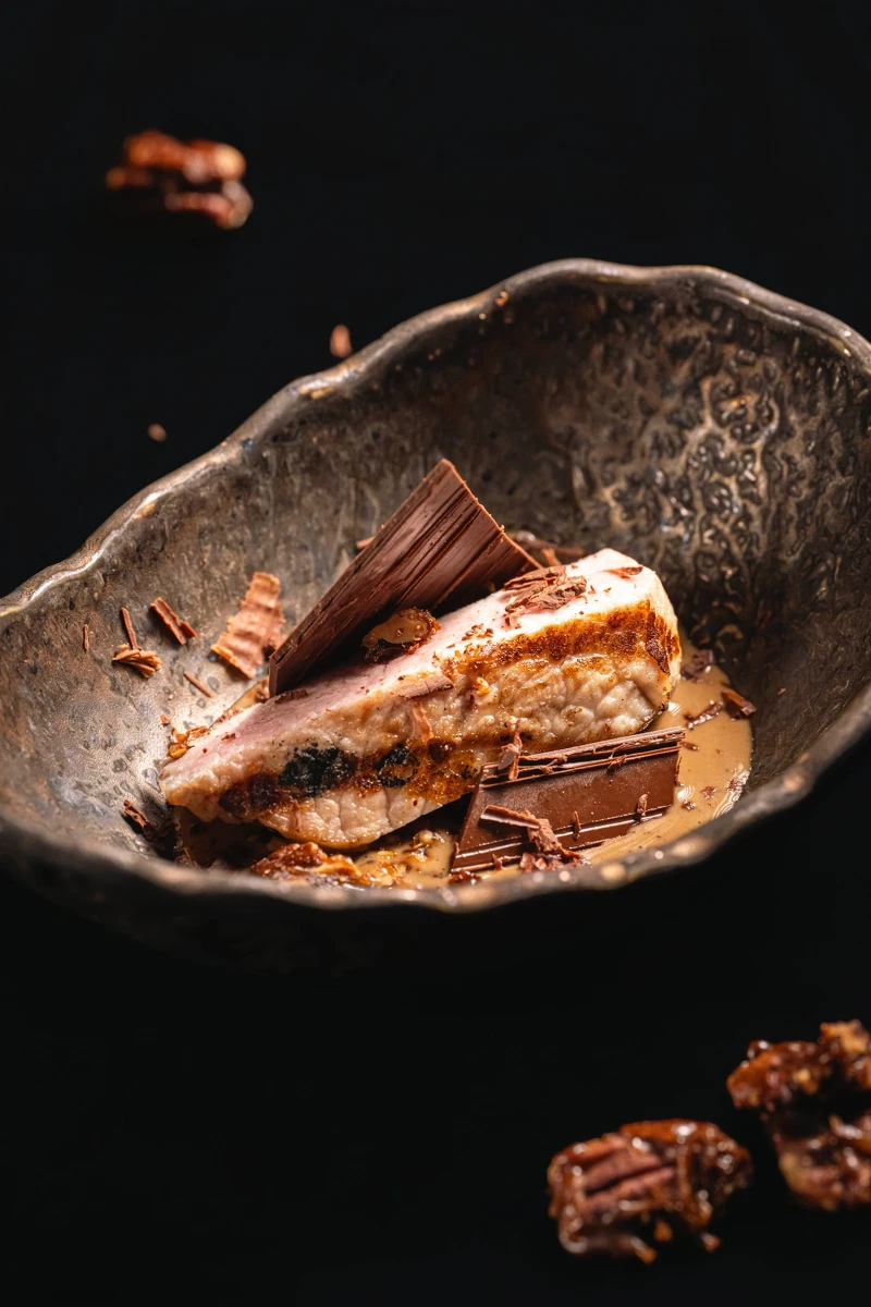 選用來自宜蘭的巧克力豬,又稱盤克夏黑豬,飼養期間除穀物飼料外,更特別添加原塊巧克力,不僅有助於調節豬隻情緒,也進一步提升肉質的細緻度與油脂香氣,體現 風味飼養的養殖哲學。選用油脂分布均勻的梅花肉,柔嫩中帶有彈性,最能展現豬肉本身的甜香與脂香,佐以雙醬汁:一款帶有微甜與奶香的咖啡醬,增添滑順厚度;另一款則融入「AKAME」 所製是來自屏東美園部落的70%黑巧克力,以苦甜平衡的可可風味與豬肉脂香交織, 最後撒上經中式五香調味處理的香脆胡桃,帶來香氣、咬感與香料餘韻,甜、香、苦 交融。