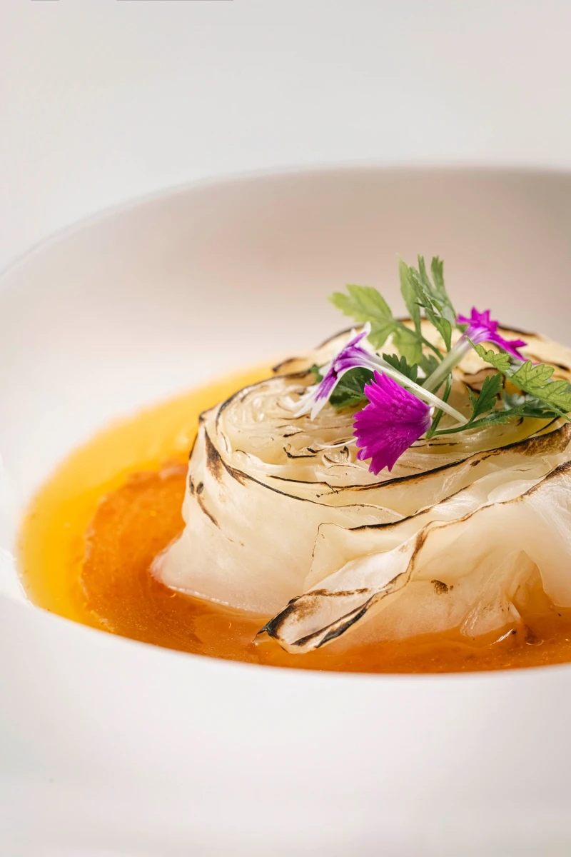 此道為鳥苑人氣經典菜品,嚴選整顆高麗菜以炭火慢 烤,外層微焦帶香,內部則保有濕潤柔嫩的口感,火候掌控精準,使高麗菜自然的甜味與淡雅的發酵香氣在烤 製過程中層層釋放,展現簡單食材的深度風味,而醬汁 則以特製辣味噌為基底,加入白酒與奶油調和,打造出香濃微辣、平衡不膩的風味,並以山蘿蔔葉點綴,為整體畫龍點睛,視覺與風味兼具,完美詮釋鳥苑一貫的細 膩與純粹。