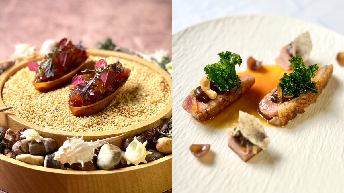 珍饈淬鍊:玫瑰玉露鴨胸,經14天乾式熟成,搭配黑蒜巧克力醬與東山龍眼,風味深沉。