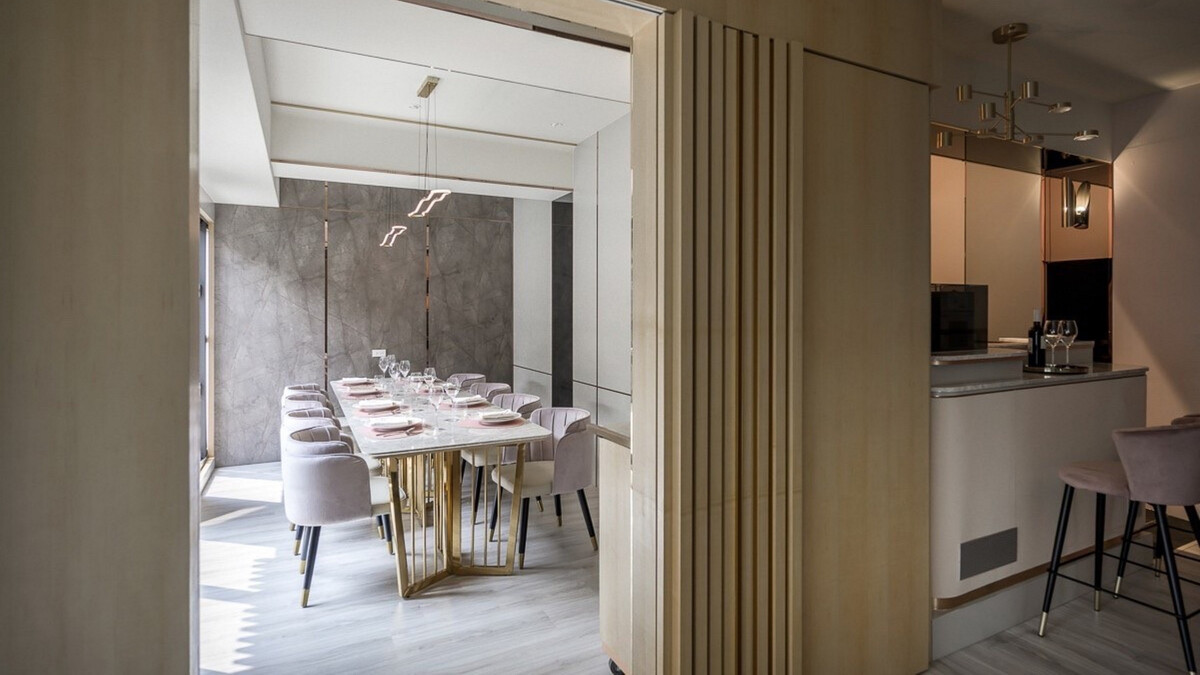 走進「方蒔」低調的楓木大門之後,是以大地色與暖粉色家具組成的空間,設計師以「海潮與島國之間」為概念,運用竹材與蚵殼粉末製成的牆面象徵永續再生,圓弧層疊的線條像是海浪的律動。整體氛圍優雅卻不拘謹,細節中充滿溫度。二樓設有包廂與吧檯,甚至有戶外陽台,非常適合小型聚會或私密宴飲喔。