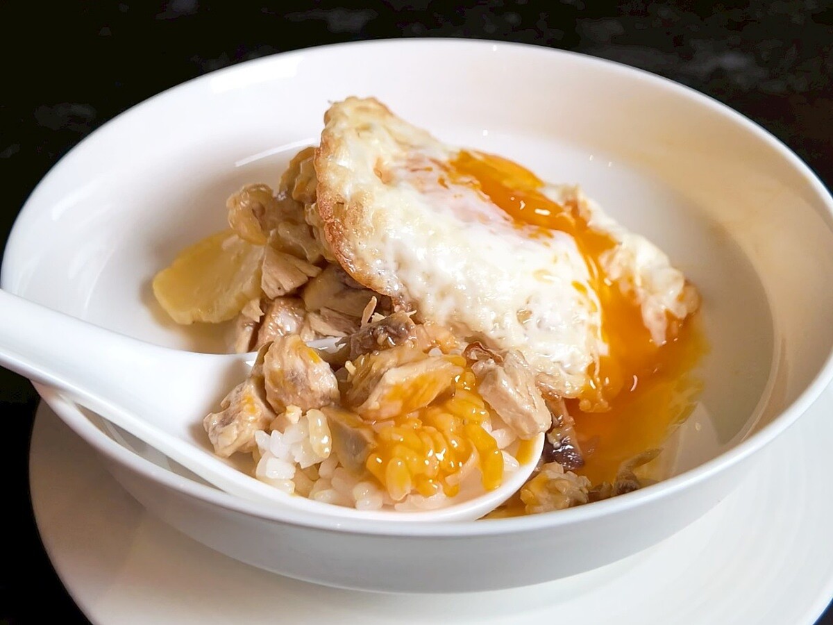 對熟悉「寒舍主人」蔡辰洋的人來說,他最常提起、也最喜愛的,正是這碗雞肉飯。沒有華麗擺盤,也不靠昂貴食材,卻能以樸實做法呈現驚豔滋味。雞肉切丁後與金黃雞皮、紅蔥頭爆香,再以醬油、雞高湯與冰糖熬成醬汁,鹹甜交織,嫩中帶韌。米飯選用顆粒分明的越光米,吸飽醬汁後覆上一顆半熟荷包蛋,蛋黃流淌,讓口感更添圓潤。這道看似簡單的料理,其實融合油溫掌控、紅蔥火候與雞油香氣等粵式基本功,看似樸素卻藏有許多細節的一道。