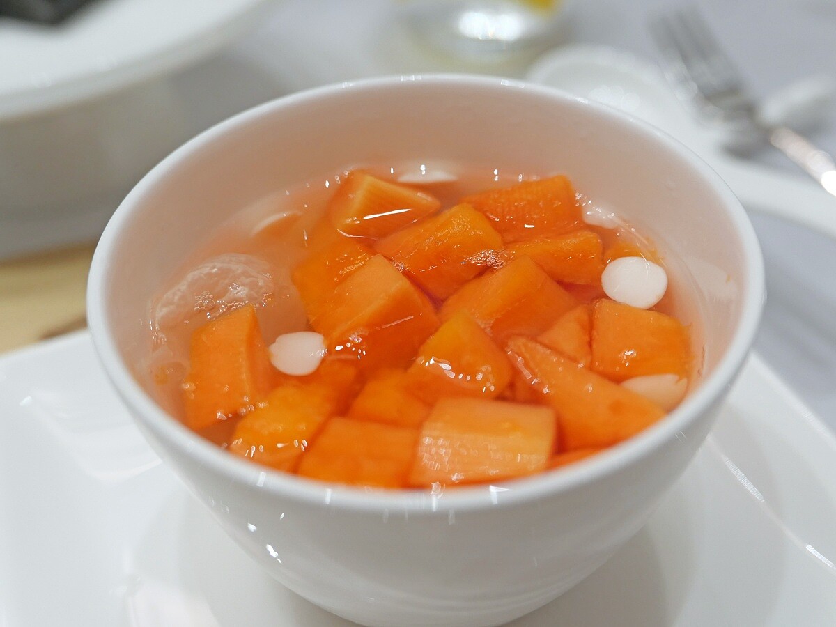 「木瓜」又名萬壽果,自古因滋補潤養而成為富貴人家的餐後佳品。與南北杏、燕窩同以文火細燉,湯色清澈,入口果香淡雅,潤而不膩。葉師傅提到這是時間相當久遠的老菜,過去都是富貴人家在喝。對他來說,重現這道甜湯不只是致敬經典,更是將粵菜藥食同源的智慧延續到今日。於現代快節奏的生活中,喝上這樣一碗溫潤的甜品彌足珍貴。