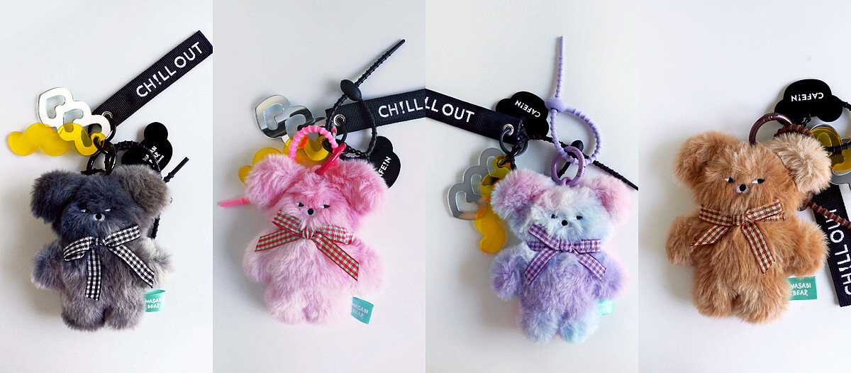 這次的聯名周邊包括兩款大頭吊飾以及玩偶,共有黑色與芥末熊經典色,其中黑色款即是CAFE!N韓的超限定款式,而WASABI BEAR娃娃吊飾則有7色,另外還有聯名款點心盤、咖啡杯、大Size購物袋等,全部都萌到想包色。