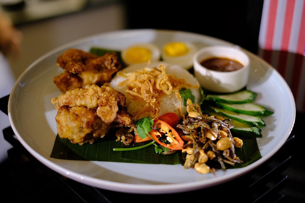 椰漿飯(Nasi Lemak)是馬來西亞的國民美食,被視為最能代表當地飲食文化的一道料理。米飯選用茉莉香米,與椰奶、香蘭葉一同慢火燜煮,粒粒分明中透出清香。這道料理的靈魂在於參巴醬,以蝦醬為底融合辣椒的辛辣、椰糖的甘潤,熬煮成紅亮濃稠的醬汁。旁邊搭配酥脆江魚仔、烤花生、黃瓜片與半顆水煮蛋,既能中和辣勁,也讓口感更加豐富,每一口都交織香、辣、甜、鮮,帶來無可取代的療癒感。