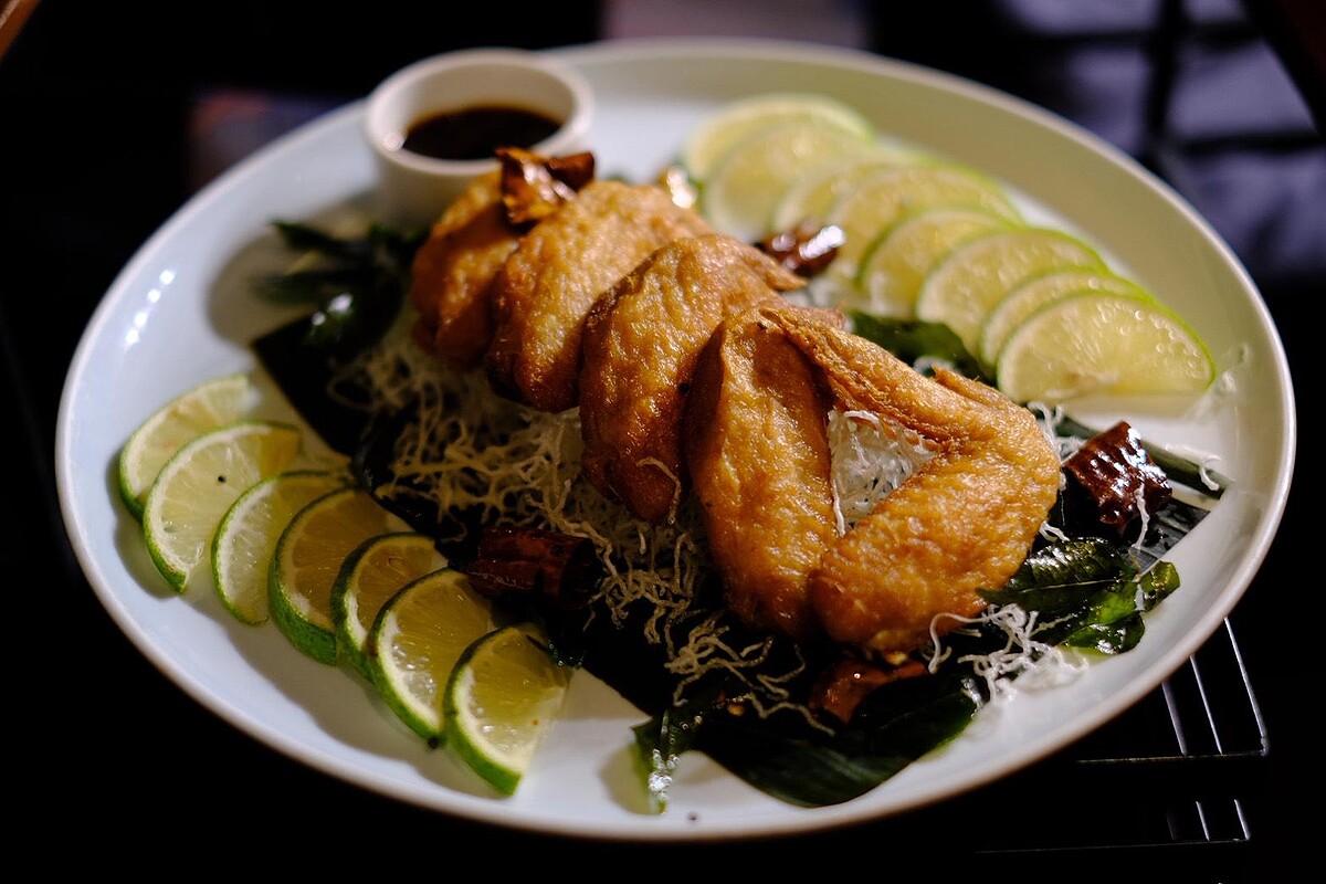 Roti Jala字面意為「網餅」,是馬來傳統節慶常見的料理。將米漿狀的麵糊裝入特製容器,在鐵板上快速繪製成細密的蕾絲網紋,薄如輕紗。餅皮帶有淡雅鵝黃色澤是來自少許黃薑粉,入口軟韌卻能吸附滿滿醬汁。搭配的咖哩雞則以椰奶、香料慢燉至肉質入味,醬汁濃郁芳香。當蕾絲餅捲起咖哩雞入口,麵皮宛如海綿般吸附湯汁,層層口感堆疊出極致風味。這道料理常出現在皇室或婚宴中,是一道象徵祝福的佳餚。