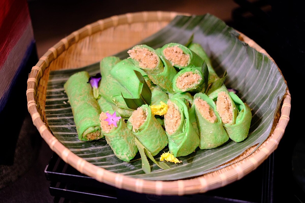 這款娘惹甜點(Kuih Dadar)是東南亞人共同的童年記憶,以新鮮香蘭葉榨汁製成翠綠色薄餅皮,軟糯中帶有獨特草本清香。內餡則將椰糖與香蘭葉熬煮成焦糖漿,再拌入現刨椰絲慢炒至黏合。椰絲保有嚼感,甜中帶點焦香。薄餅皮將椰絲餡緊緊包裹,成為手掌大小的翠綠小卷。一口咬下,清新的香蘭氣息與濃郁椰糖完美融合,甜而不膩,讓人回味無窮。