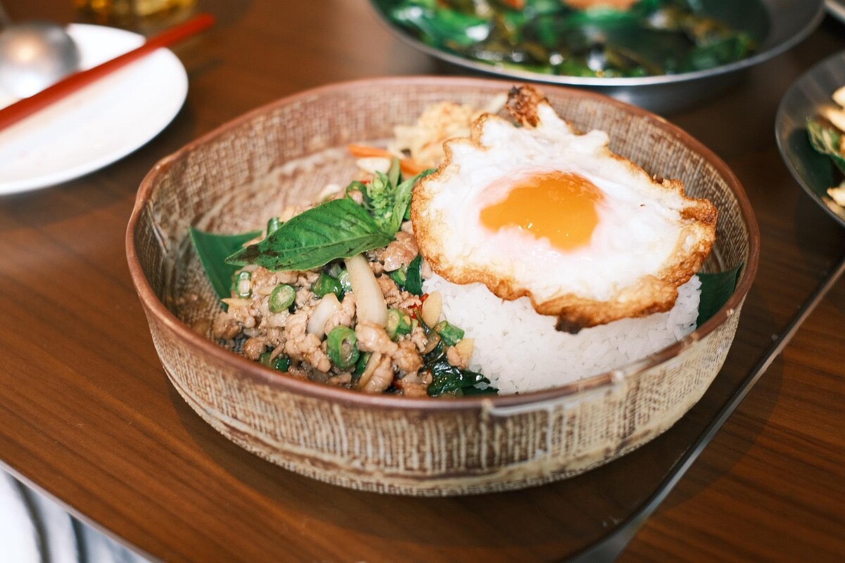 這道料理將經典泰式打拋豬升級演繹,現拌豬絞肉加入九層塔、蒜末與辣椒爆香,再搭配魚露、高湯與少許砂糖調味,鹹香與辛辣交錯香氣濃烈。最後淋在熱騰騰的泰香米飯上,搭配半熟荷包蛋,蛋黃在米飯中流動讓層次更飽滿。入口後濃郁香氣與辣韻在舌尖盤旋,堪稱最下飯的泰式經典。