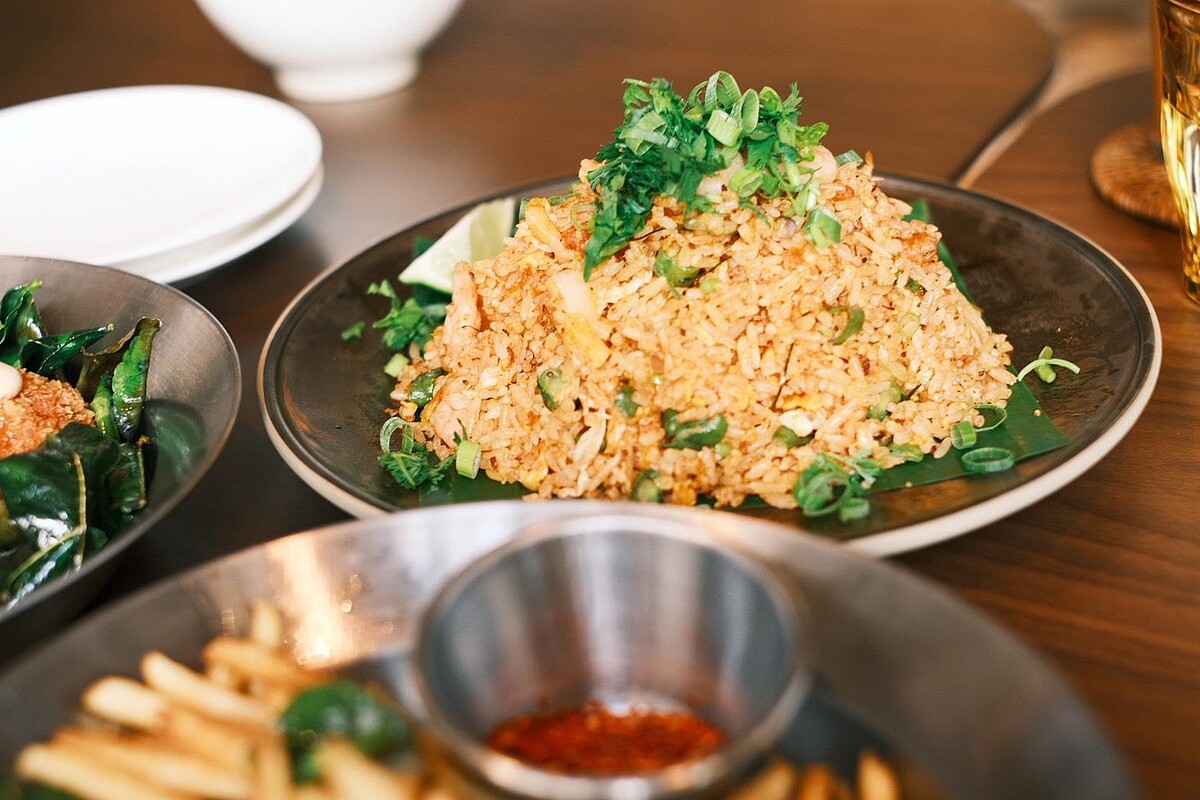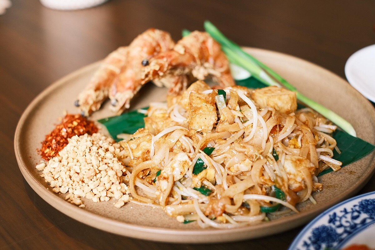 經典泰式街頭美食被演繹得更精緻,河粉搭配鴨蛋與爽脆豆芽翻炒,加入羅望子醬調和酸、甜、鹹三味,酸甜中帶點焦香。再鋪上炸至金黃的大蝦,蝦殼薄脆能與肉一同入口,帶來滿足口感。最後撒上花生碎並擠上檸檬汁,香氣鮮明,是道地曼谷風味的代表。
