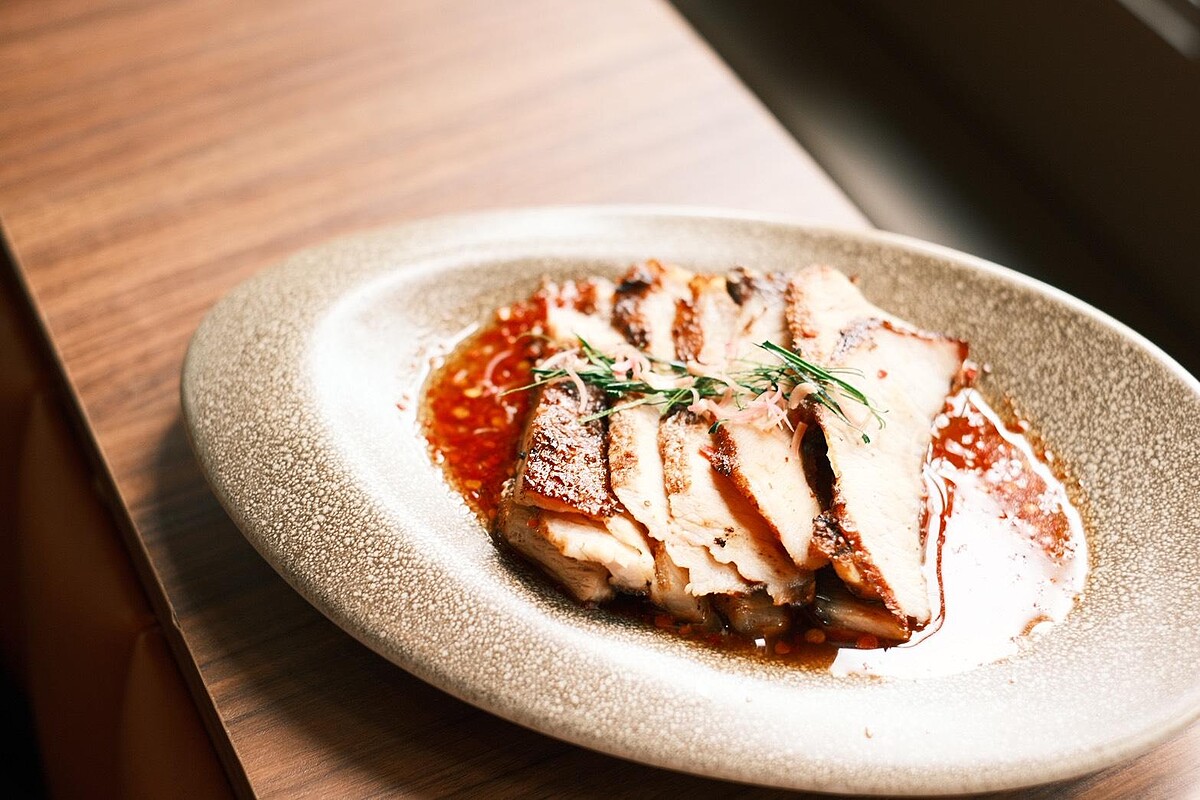 松阪豬先以棕櫚糖與椰糖醃漬6小時,再以低溫爐烤10至15分鐘熟成。肉質彈脆,油脂香氣馥郁卻不顯油膩。搭配檸檬葉絲與特製泰式糙米酸辣醬,帶有獨特米香,清爽又有層次。每一口都像是炭火與香草的記憶被重新喚醒,極具南洋風情。