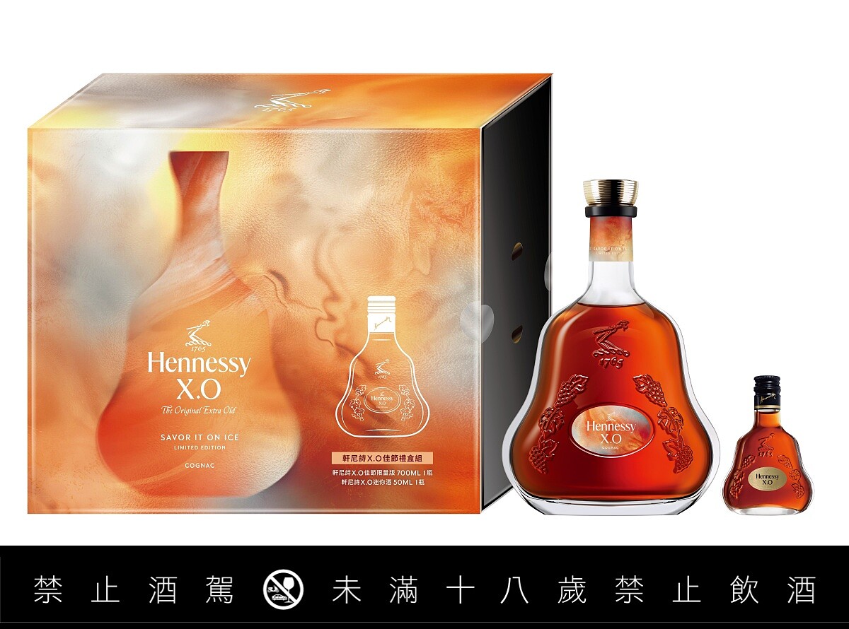 以沉穩琥珀色澤與黑胡椒、蜜餞水果、巧克力交織出的深邃香氣,展現軒尼詩長達150年的干邑釀造工藝。V.S.O.P 雙瓶禮盒 NT1,595(含700ml + 50ml)、X.O 雙瓶禮盒 NT6,470(含700ml + 50ml)