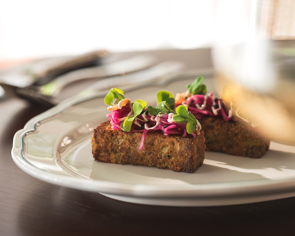 在法國料理傳統中,開胃小點(Amuse-bouche)不僅是味覺的暖身,更是餐桌故事的序曲。以豬耳朵蛋糕迎接正餐前的小點,正是源自里昂的日常風味。Chef Leo 特別介紹:「第一道開胃菜那道是豬耳朵蛋糕,那其實就是非常非常典型里昂的名菜。他們也是當作開胃小點,簡單吃,鹹香又有滋味。」里昂素有「法國美食之都」之名,隆河阿爾卑斯大區因地緣與歷史而深受豬肉飲食影響,從香腸、臘肉到滷製與燉煮,皆展現質樸卻深厚的地方記憶,而鹹蛋糕(Cake sale)正是其中具代表性的料理。主廚以鹹的磅蛋糕為底,將蔬菜高湯燉滷、帶韌性的豬耳朵與干蔥、巴西里、葛瑞爾起司交融,鋪上炸豬耳朵、芥末酸奶與醃漬紫甘藍,香氣與口感兼備。