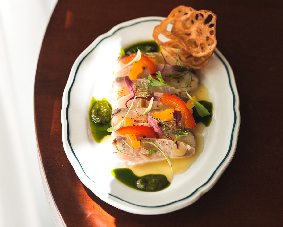 在法國料理中,「Carpaccio」指以生魚為主的料理,將魚肉切成薄片,僅以檸檬汁、橄欖油、鹽與胡椒簡單調味,突顯食材本味。選用台灣紅甘魚,其細膩彈牙的肉質與適中油脂最為迷人,輕炙過後,更添鮮甜,搭配自製乳香發酵甜椒、墨西哥辣椒與蓮藕脆片,帶來酸香、辛辣與爽脆的多重口感,最後淋上青醬與檸檬油醋醬,雖然清新卻又有豐富的層次。(NT480)