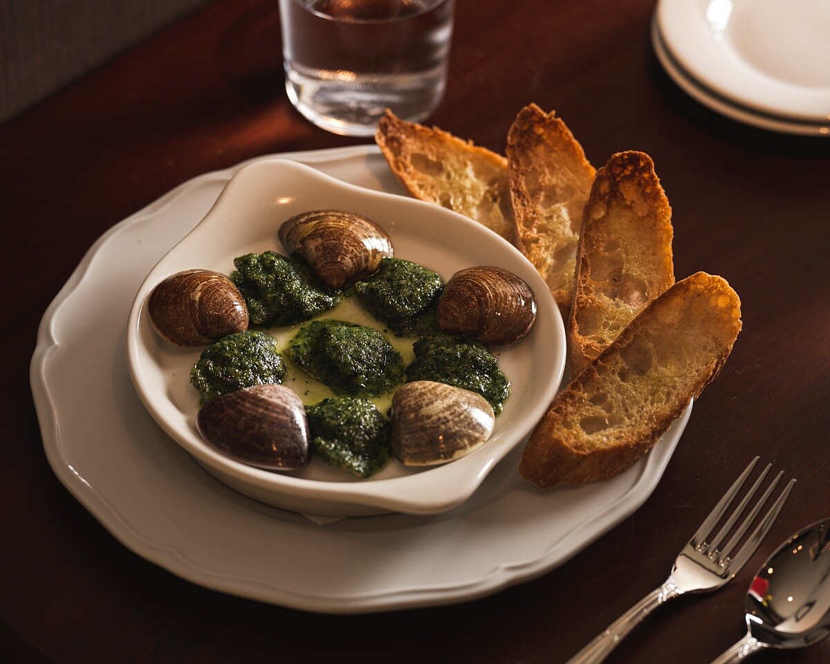 靈感來自巴黎經典的焗田螺,此道料理最早出現在巴黎廚具老街蒙托格伊路,以香氣濃郁的大蒜、香芹與奶油調和出迷人風味。Chef Leo 解釋這道菜的創意轉換:「這道有點台灣 twist 的做法,因為外面烤蝸牛太多了,我們就覺得蝸牛是屬於大地的滋味,那希望放一點海洋的滋味來呈現,所以選了大蛤。上面的那個大蒜香芹奶油(beurre d’ail et persil)還是原汁原味還原。」以鮮味飽滿的大蛤取代田螺,將傳統手法轉化為別具巧思的呈現,入口時,奶油的醇厚、大蒜的辛香與蛤蜊的鮮美交織,既保留了傳統巴黎風味的經典輪廓,為味蕾帶來新的驚喜,搭配上一旁的麵包片,讓人欲罷不能。(NT480)