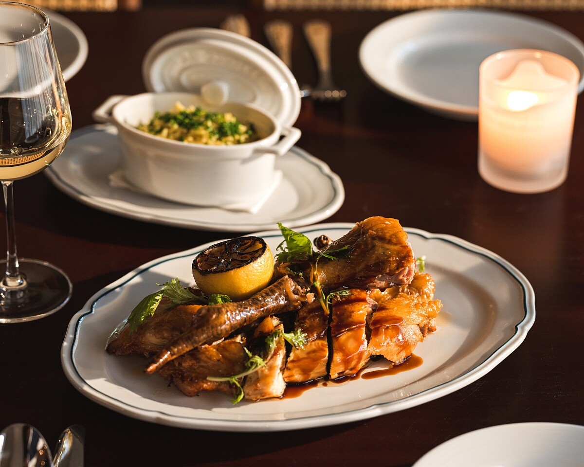 靈感來自巴黎歷史悠久的銀塔餐廳(La Tour d'Argent)經典血鴨料理,也是法國特別是巴黎與西南部地區,向來偏愛以鴨胸入饌。選用屏東振聲鴨,外皮香煎至酥脆,醬汁以雞高湯為底,融合橙果泥、香料、雪莉酒醋與香橙干邑酒;更特別的是,將青蒜綠色段炭烤後煉製成灰燼油(ash oil),帶來獨特的煙燻氣息,增添深沉韻味。(NT1,280)