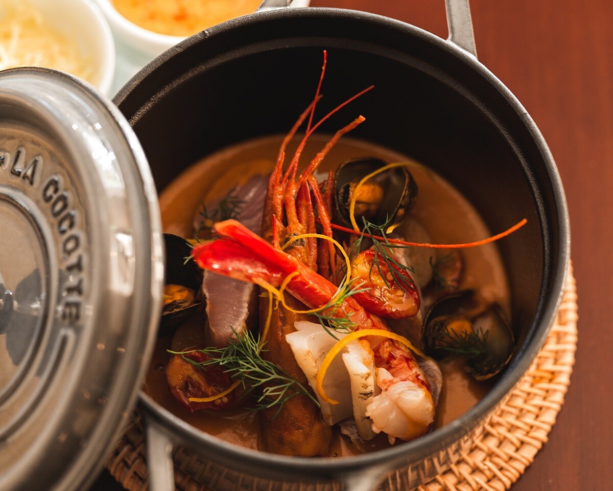 源自南法馬賽的經典湯品,以濃郁湯底而聞名。一開始是漁夫以當日漁獲熬煮的家常湯品,如今已成為法國最具代表性的經典之一。Chef Leo 則說道選擇這道菜的原因:「除了馬賽魚湯大概就是,因為我們會放大,不只是做里昂菜,我們會往南做點,普羅旺斯南方的東西。海鮮也是一個台灣很重要的物產,所以我們把馬賽魚湯盡量做得優雅細緻,然後有台灣的風味在裡面。」湯底以魚骨、蟹殼與蝦殼搭配大量蔬菜拌炒後熬煮,加入番紅花與茴香酒兩種不可或缺的經典元素,賦予鮮明香氣與層次。依循傳統,搭配大蒜番紅花蛋黃醬(Rouille)與葛瑞爾起司,濃厚海味與香料風味更顯和諧,完整呈現普羅旺斯風情。(NT1,680)